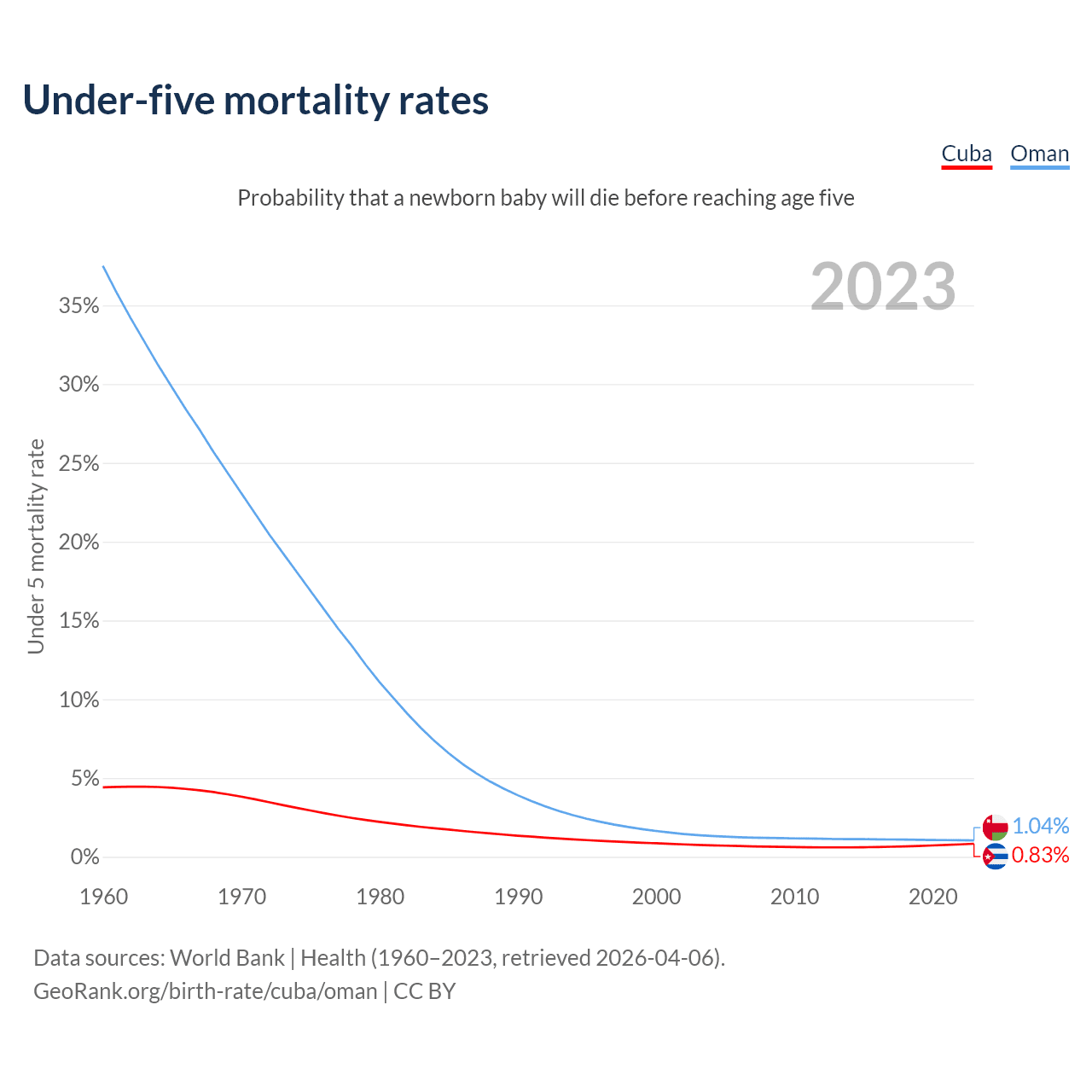 The chance that a newborn baby will die before reaching age five is 0.83% in Cuba and 1.04% in Oman. Above is a chart with historical data on under-five mortality rates.