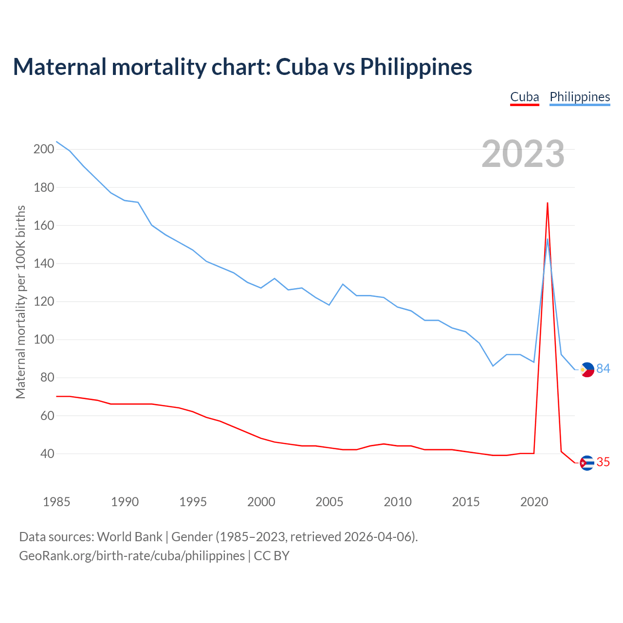 The maternal mortality rate, which is the probability of dying during childbirth or within 42 days of pregnancy termination, is 35 deaths per 100,000 live births in Cuba, compared to 84 deaths in the Philippines.