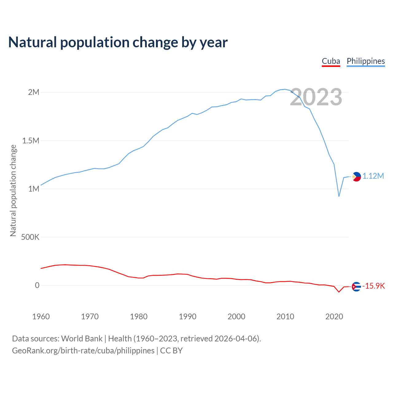 According to the latest available data on birth rates, the fertility rate in Cuba was 1.44 children per woman in 2023, compared to 1.92 in the Philippines in 2023. The replacement level is considered to be 2.1 children per woman.