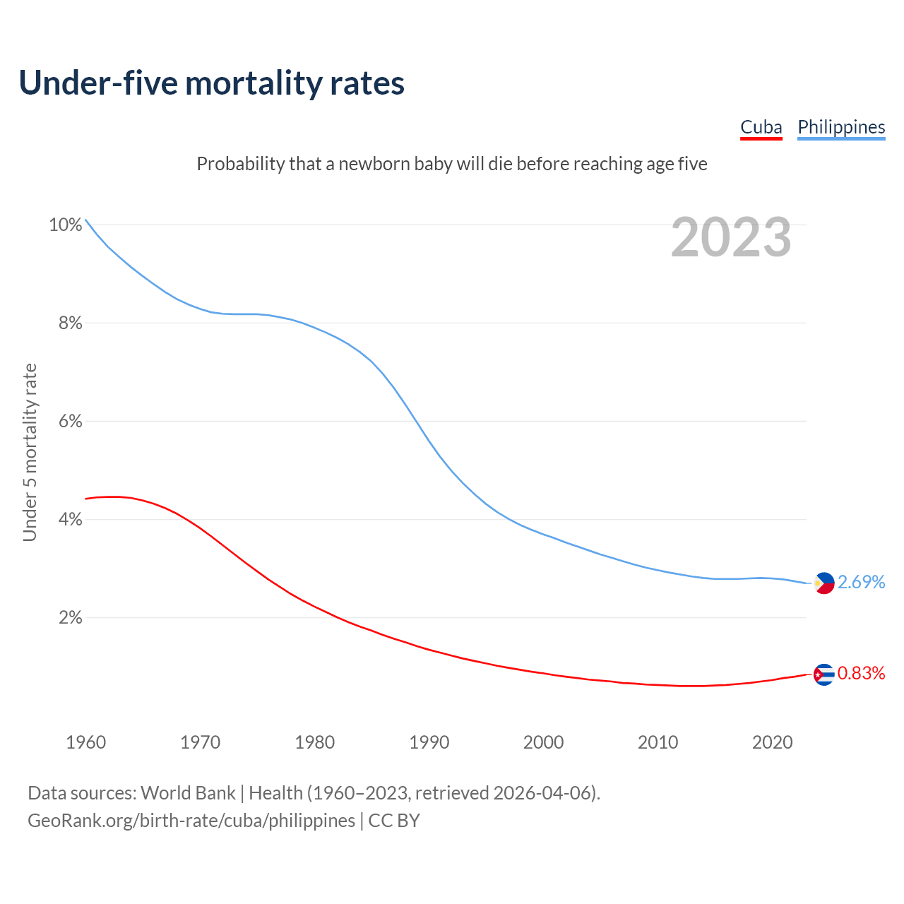 The chance that a newborn baby will die before reaching age five is 0.83% in Cuba and 2.69% in the Philippines. Above is a chart with historical data on under-five mortality rates.