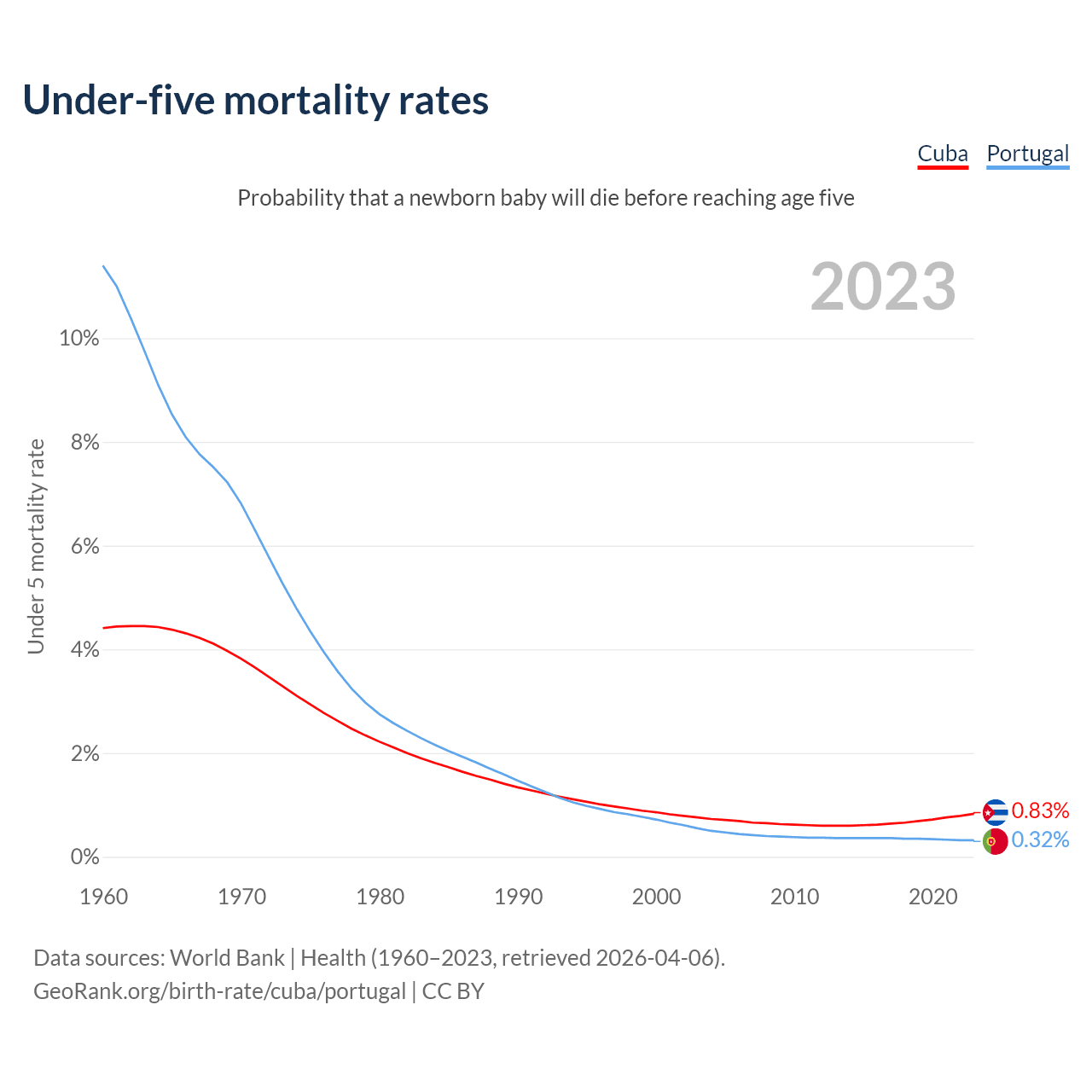 The chance that a newborn baby will die before reaching age five is 0.83% in Cuba and 0.32% in Portugal. Above is a chart with historical data on under-five mortality rates.
