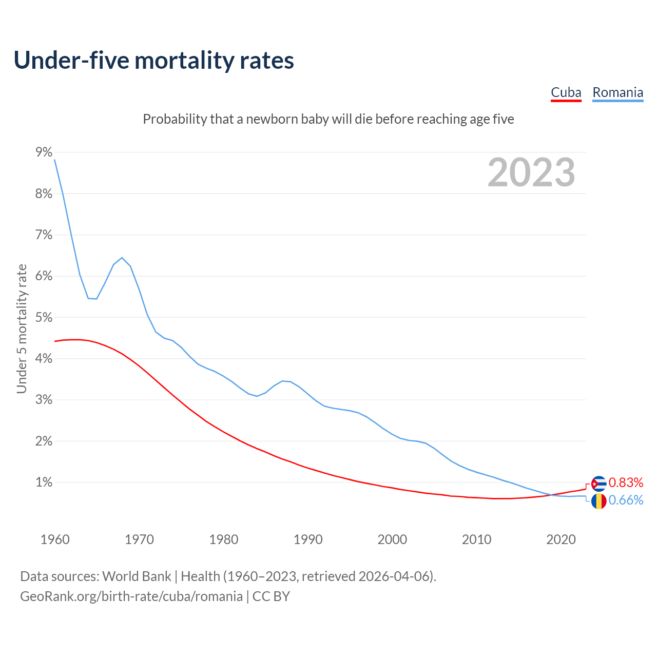 The chance that a newborn baby will die before reaching age five is 0.83% in Cuba and 0.66% in Romania. Above is a chart with historical data on under-five mortality rates.