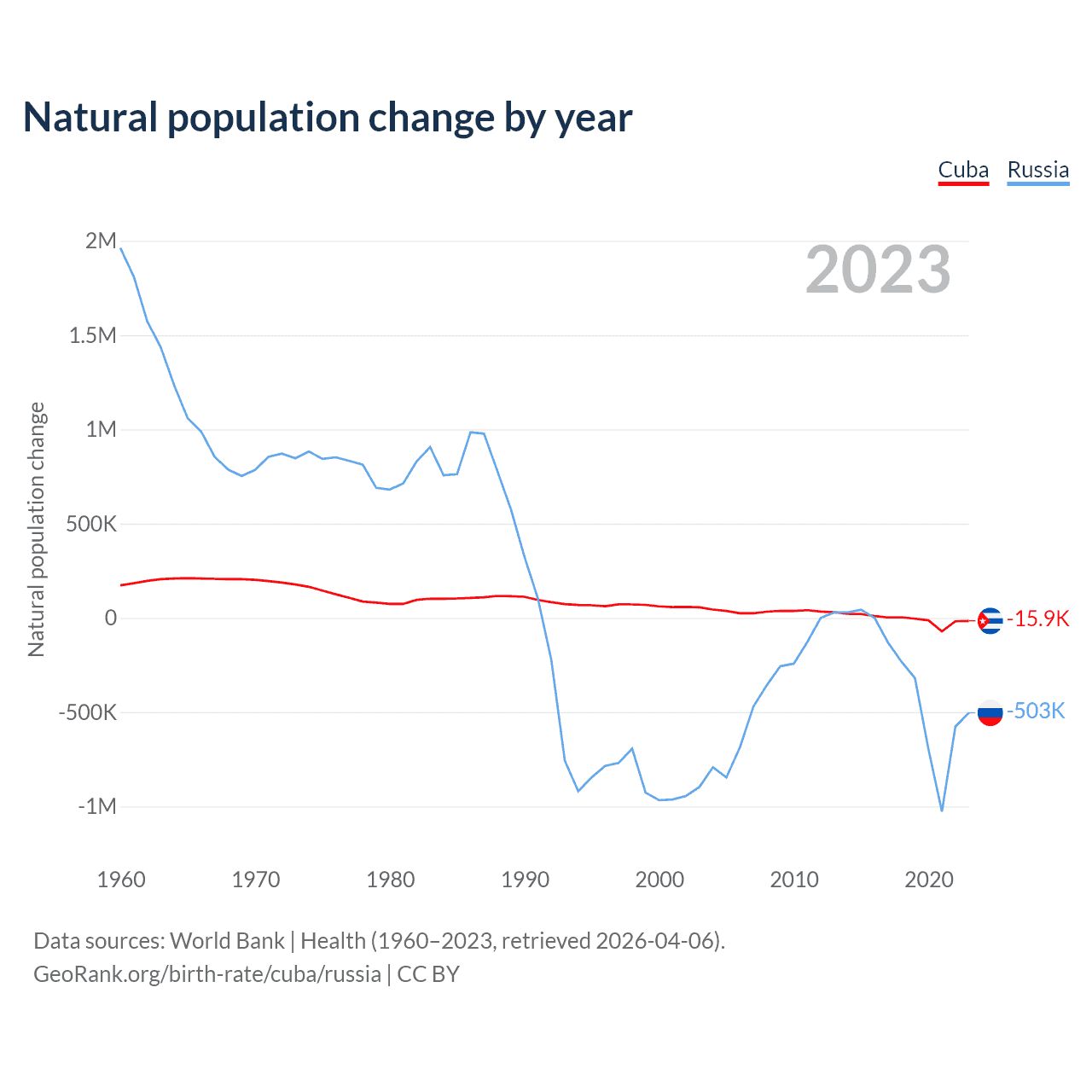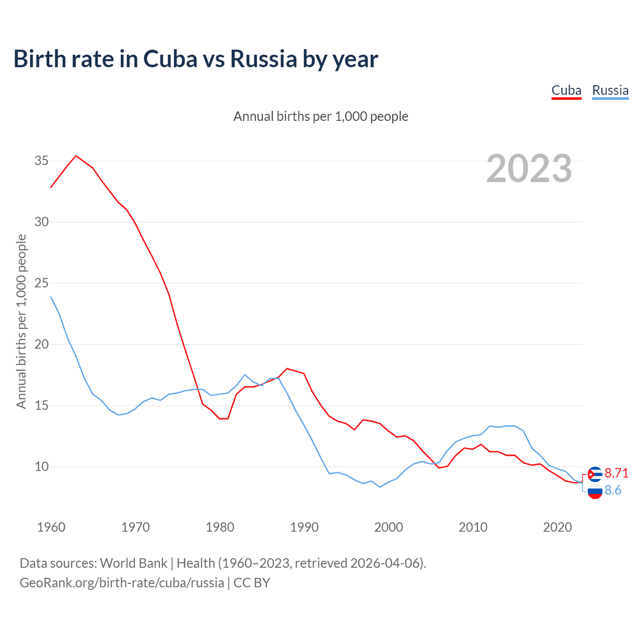 Cuba has an annual birth rate of 8.71 births per 1,000 people, compared to 8.6 for Russia. The average number of children a woman is expected to have during her lifetime — the fertility rate, is 1.44 in Cuba and 1.41 in Russia — 2.02% difference.