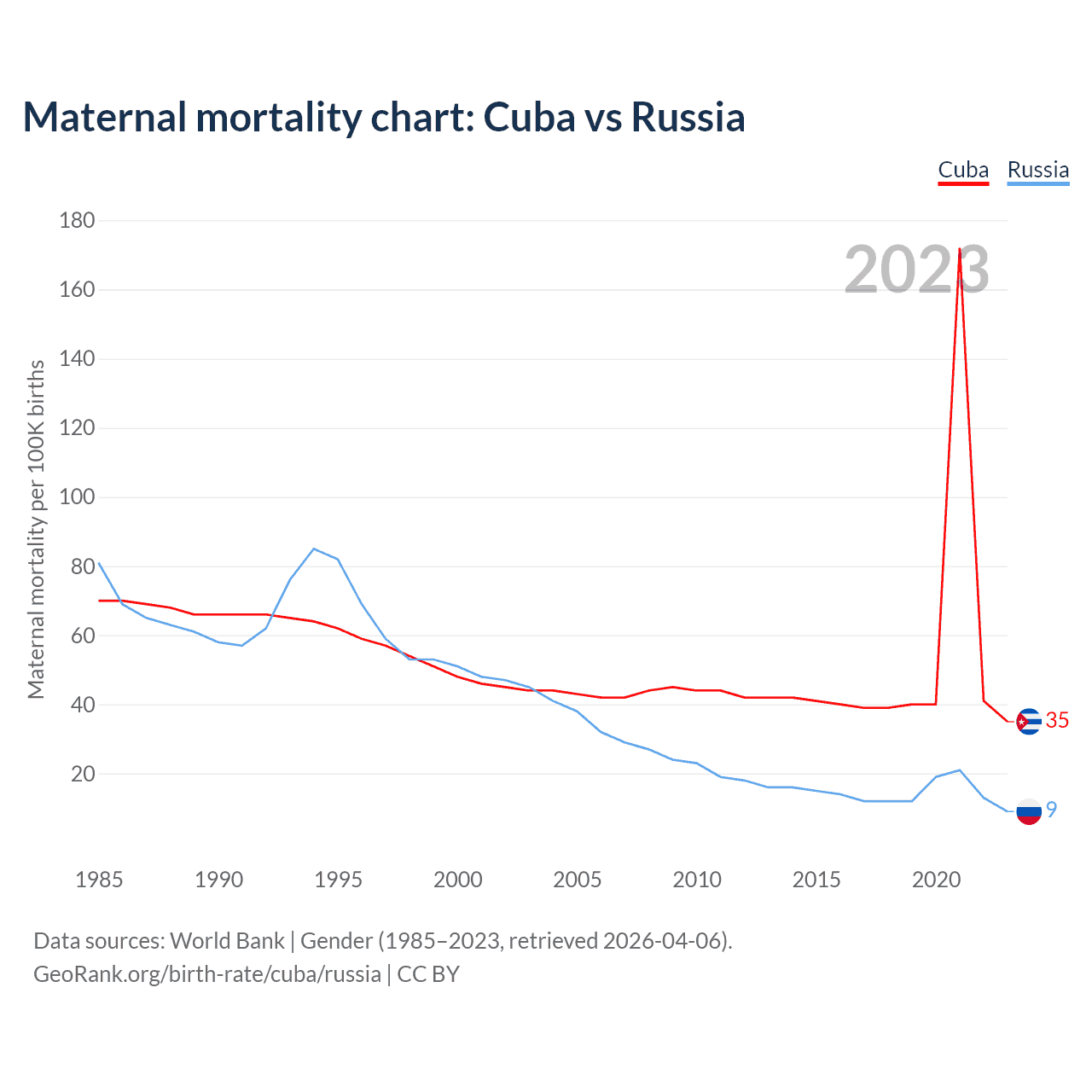 The maternal mortality rate, which is the probability of dying during childbirth or within 42 days of pregnancy termination, is 35 deaths per 100,000 live births in Cuba, compared to 9 deaths in Russia.