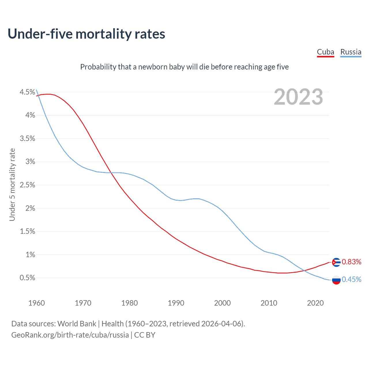The chance that a newborn baby will die before reaching age five is 0.83% in Cuba and 0.45% in Russia. Above is a chart with historical data on under-five mortality rates.