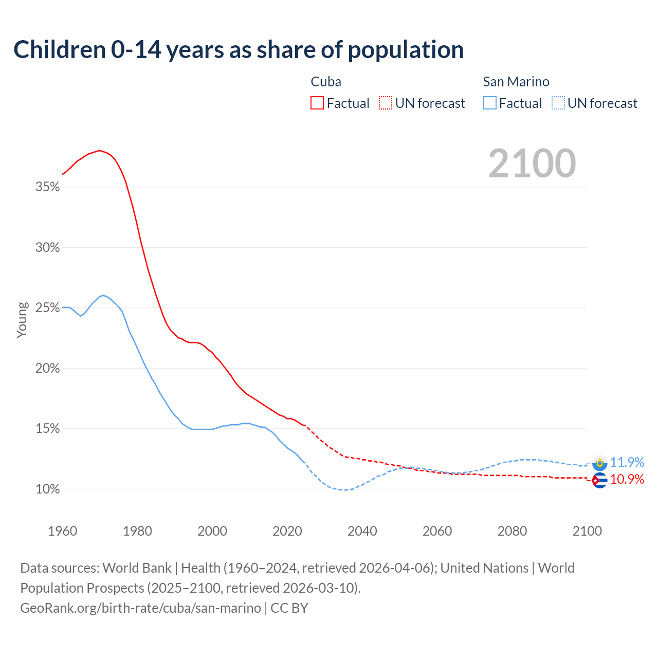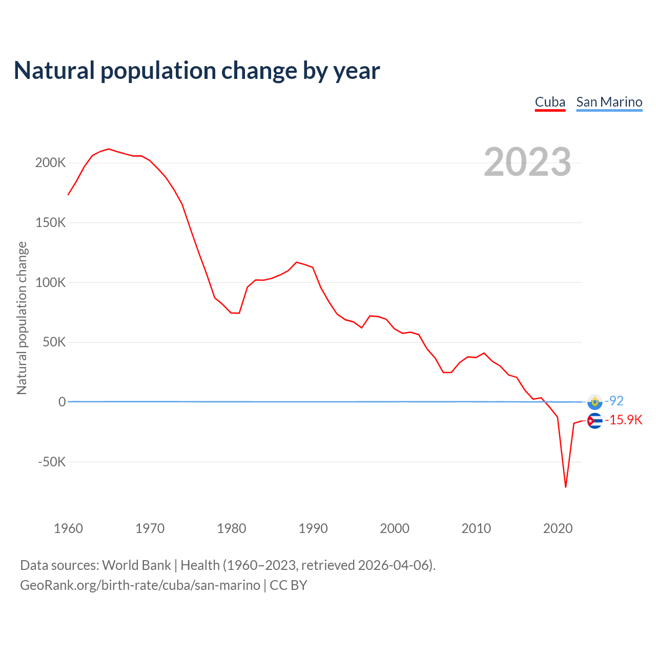 According to the latest available data on birth rates, the fertility rate in Cuba was 1.44 children per woman in 2023, compared to 1.15 in San Marino in 2023. The replacement level is considered to be 2.1 children per woman.