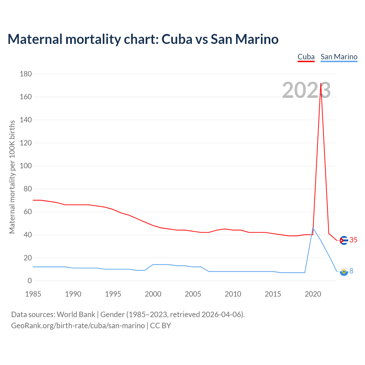The maternal mortality rate, which is the probability of dying during childbirth or within 42 days of pregnancy termination, is 35 deaths per 100,000 live births in Cuba, compared to 8 deaths in San Marino.