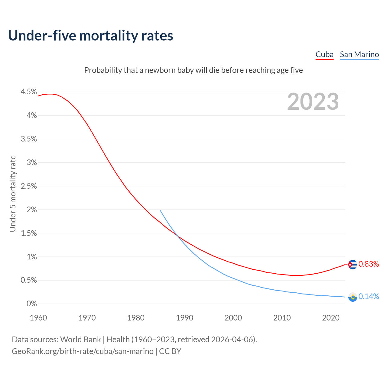 The chance that a newborn baby will die before reaching age five is 0.83% in Cuba and 0.14% in San Marino. Above is a chart with historical data on under-five mortality rates.