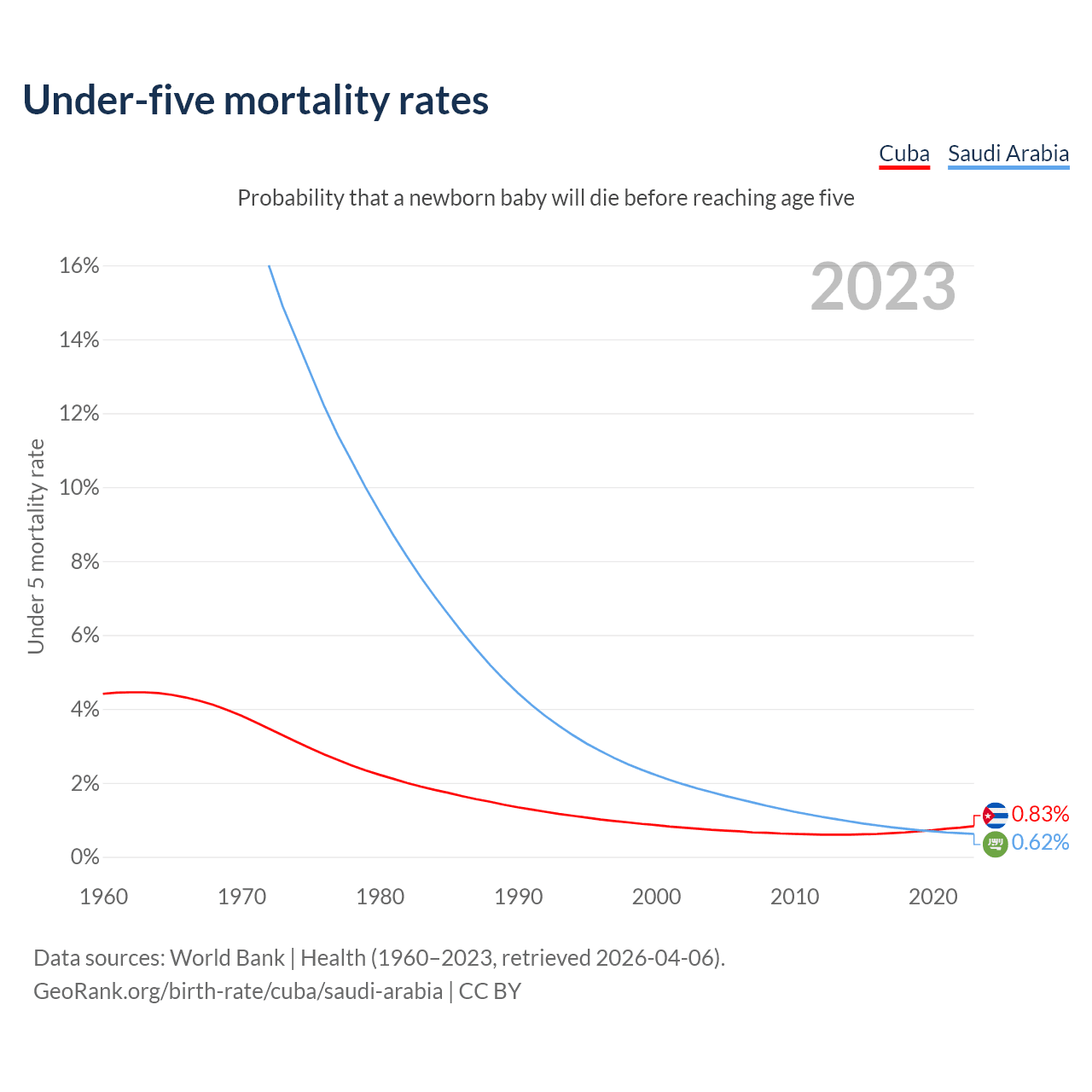 The chance that a newborn baby will die before reaching age five is 0.83% in Cuba and 0.62% in Saudi Arabia. Above is a chart with historical data on under-five mortality rates.