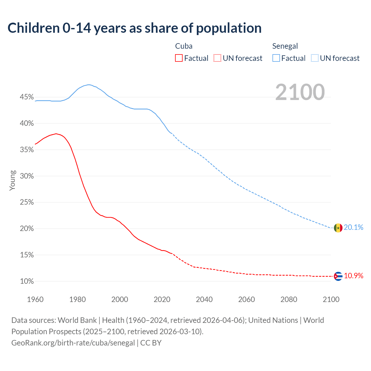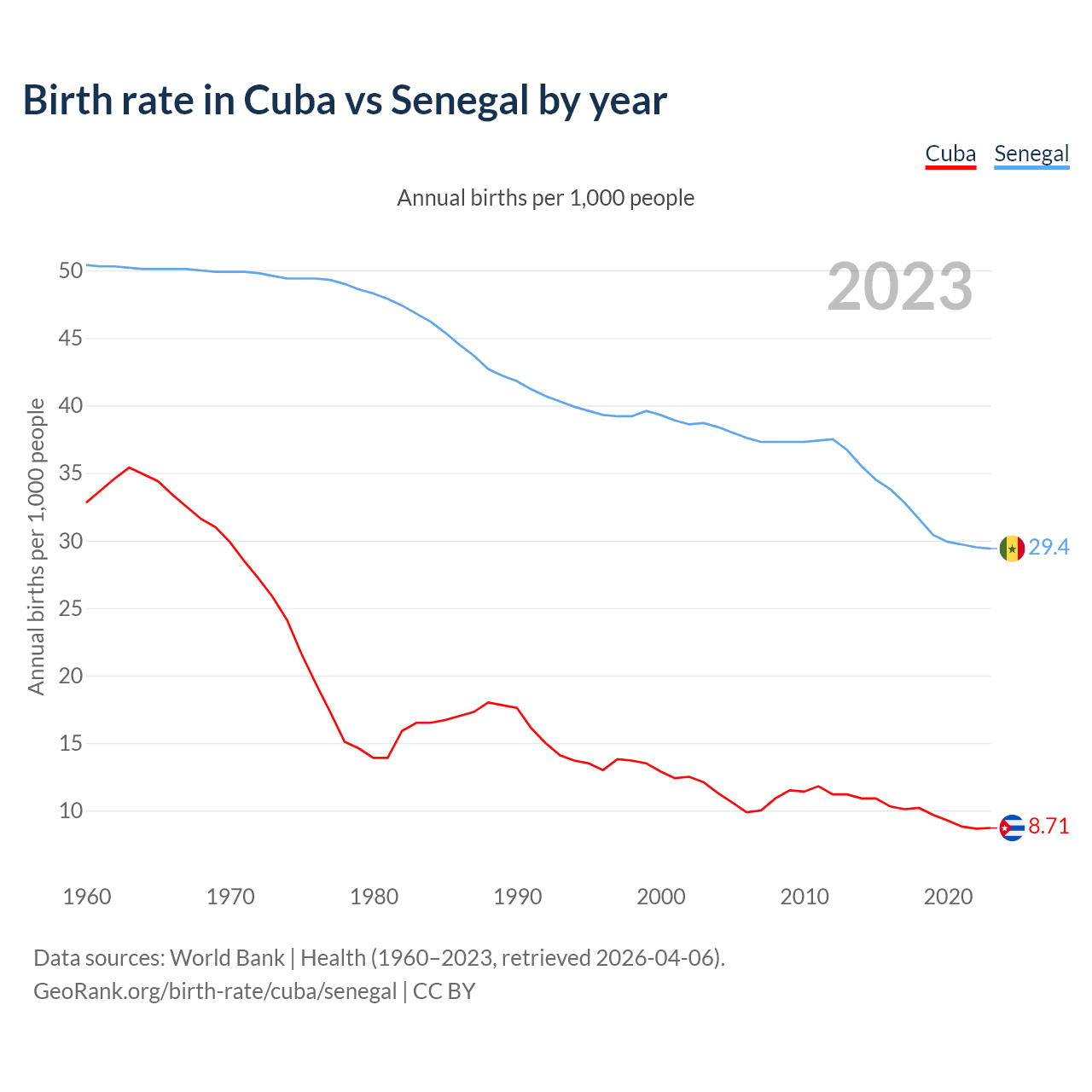 Cuba has an annual birth rate of 8.71 births per 1,000 people, compared to 29.4 for Senegal. The average number of children a woman is expected to have during her lifetime — the fertility rate, is 1.44 in Cuba and 3.82 in Senegal — 165.3% difference.