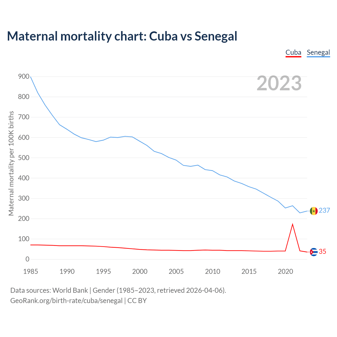 The maternal mortality rate, which is the probability of dying during childbirth or within 42 days of pregnancy termination, is 35 deaths per 100,000 live births in Cuba, compared to 237 deaths in Senegal.