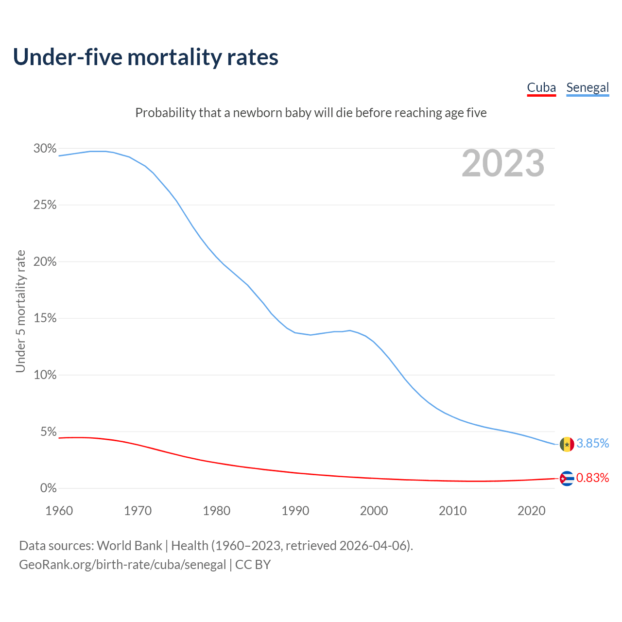 The chance that a newborn baby will die before reaching age five is 0.83% in Cuba and 3.85% in Senegal. Above is a chart with historical data on under-five mortality rates.