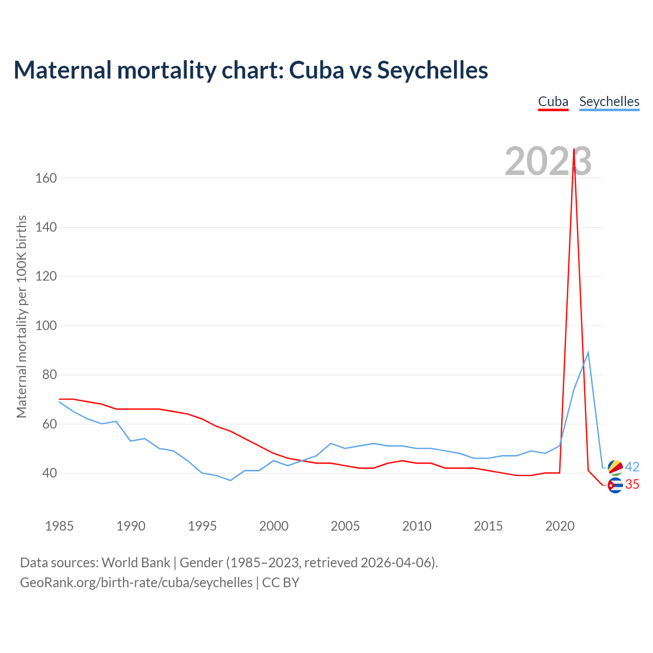 The maternal mortality rate, which is the probability of dying during childbirth or within 42 days of pregnancy termination, is 35 deaths per 100,000 live births in Cuba, compared to 42 deaths in the Seychelles.