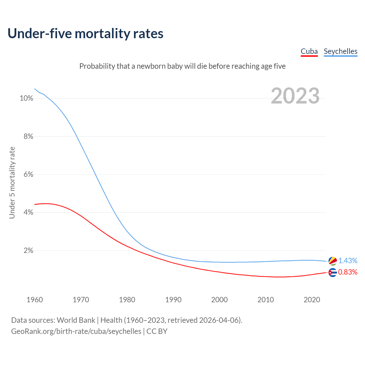 The chance that a newborn baby will die before reaching age five is 0.83% in Cuba and 1.43% in the Seychelles. Above is a chart with historical data on under-five mortality rates.