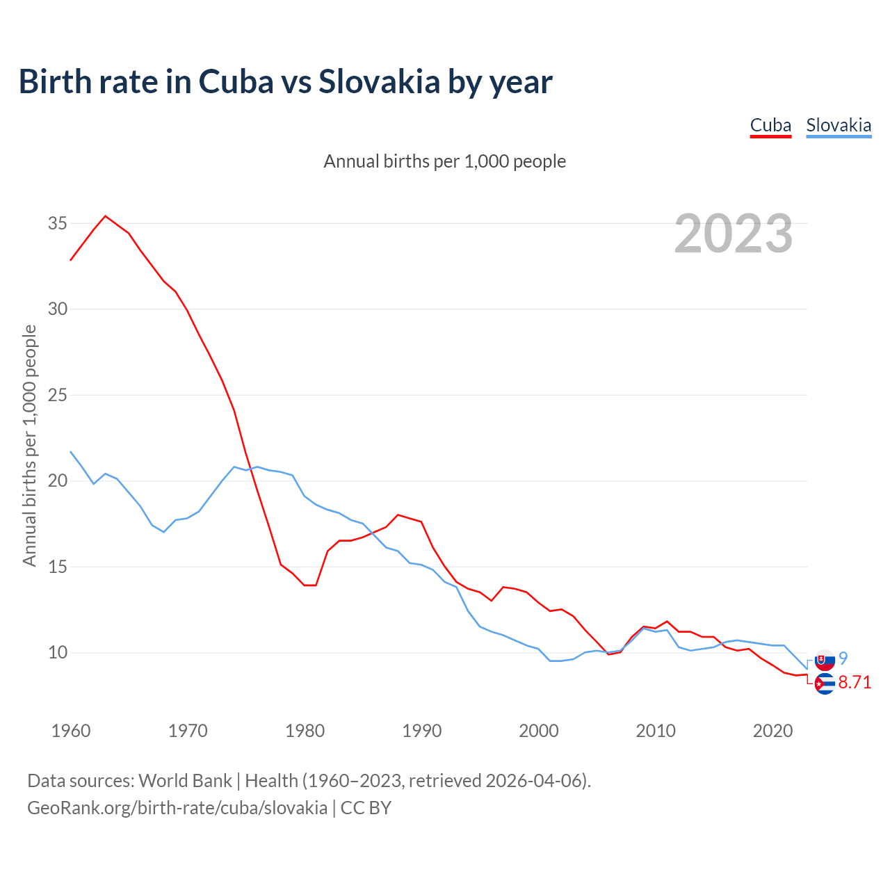 Cuba has an annual birth rate of 8.71 births per 1,000 people, compared to 9 for Slovakia. The average number of children a woman is expected to have during her lifetime — the fertility rate, is 1.44 in Cuba and 1.49 in Slovakia — 3.54% difference.
