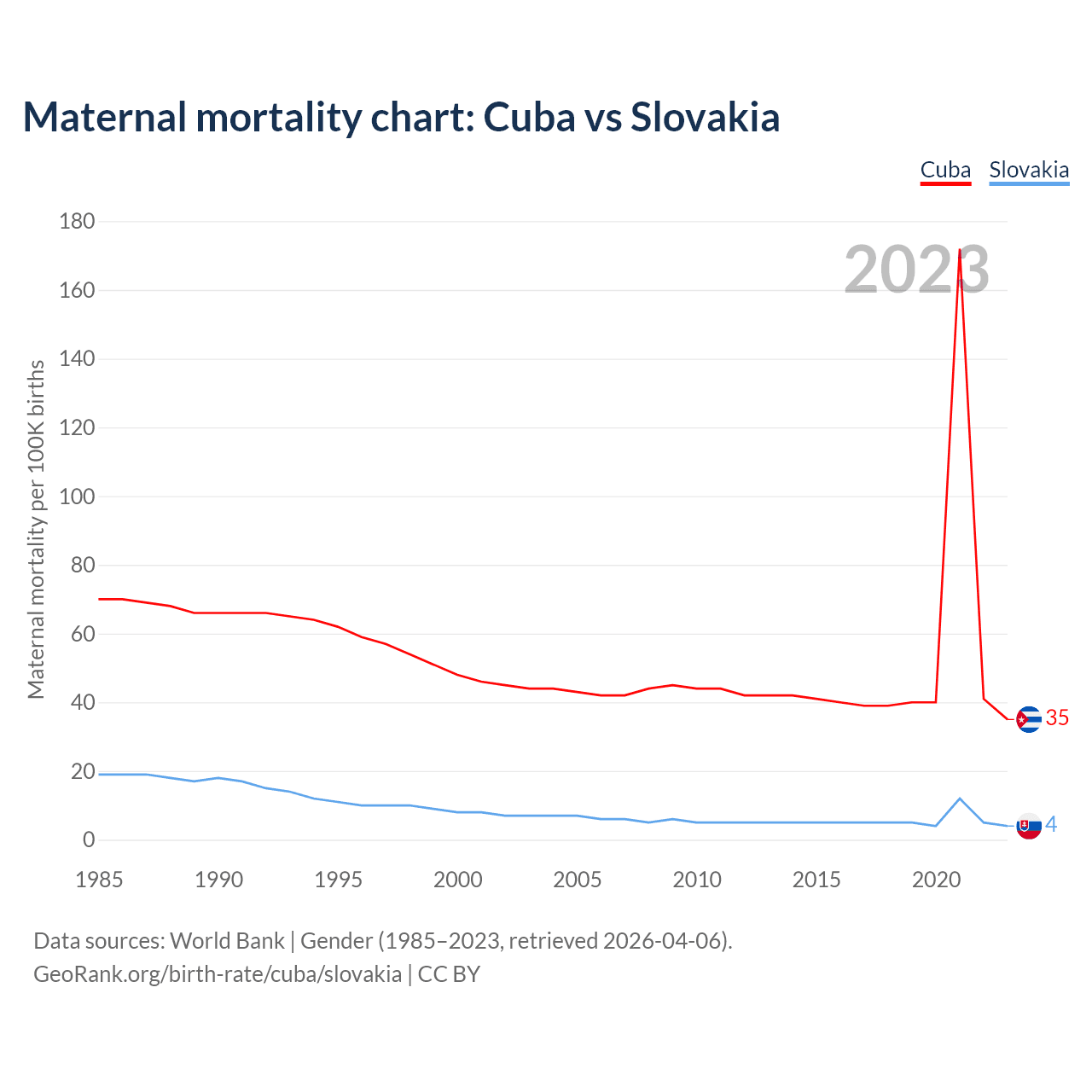 The maternal mortality rate, which is the probability of dying during childbirth or within 42 days of pregnancy termination, is 35 deaths per 100,000 live births in Cuba, compared to 4 deaths in Slovakia.
