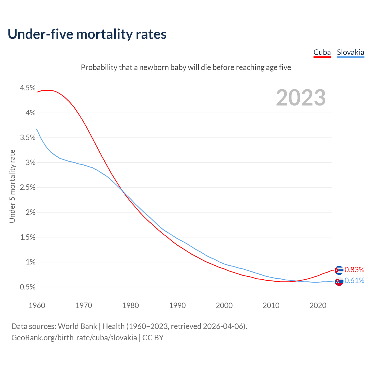 The chance that a newborn baby will die before reaching age five is 0.83% in Cuba and 0.61% in Slovakia. Above is a chart with historical data on under-five mortality rates.
