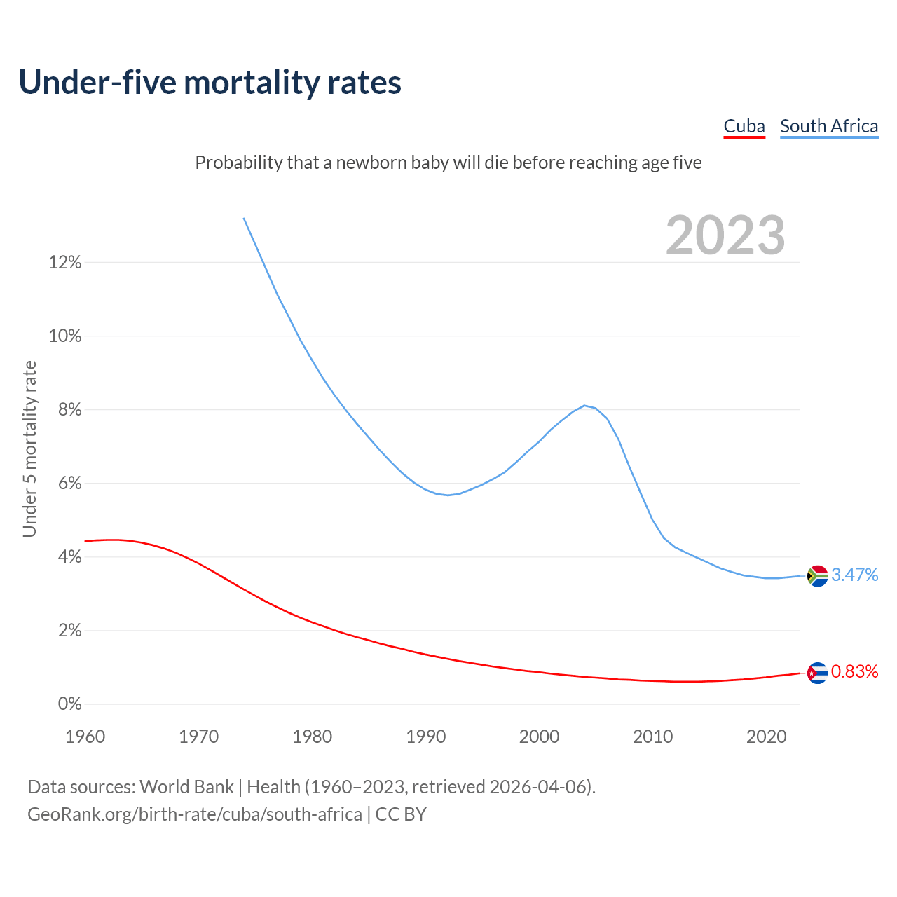 The chance that a newborn baby will die before reaching age five is 0.83% in Cuba and 3.47% in South Africa. Above is a chart with historical data on under-five mortality rates.