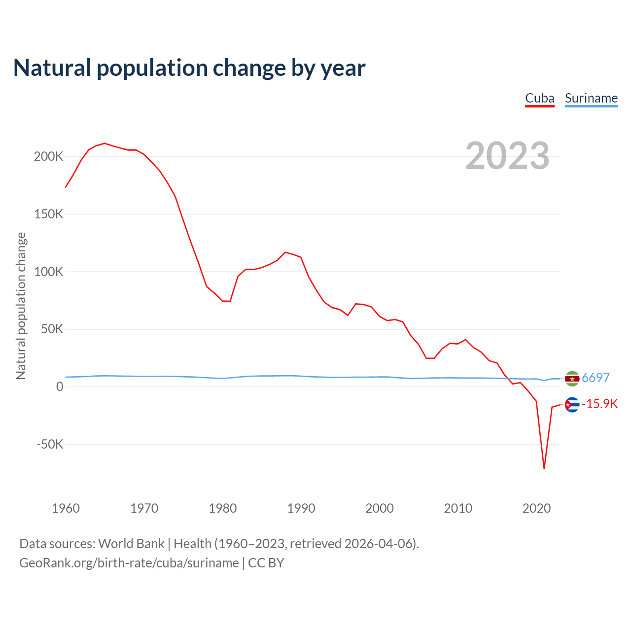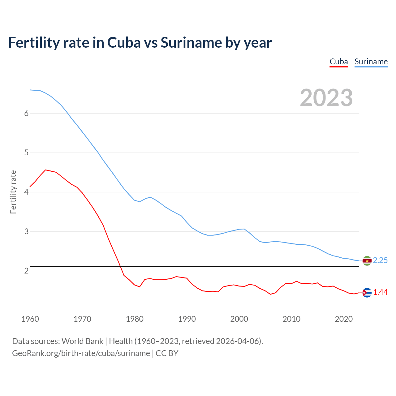 According to the latest available data on birth rates, the fertility rate in Cuba was 1.44 children per woman in 2023, compared to 2.25 in Suriname in 2023. The replacement level is considered to be 2.1 children per woman.