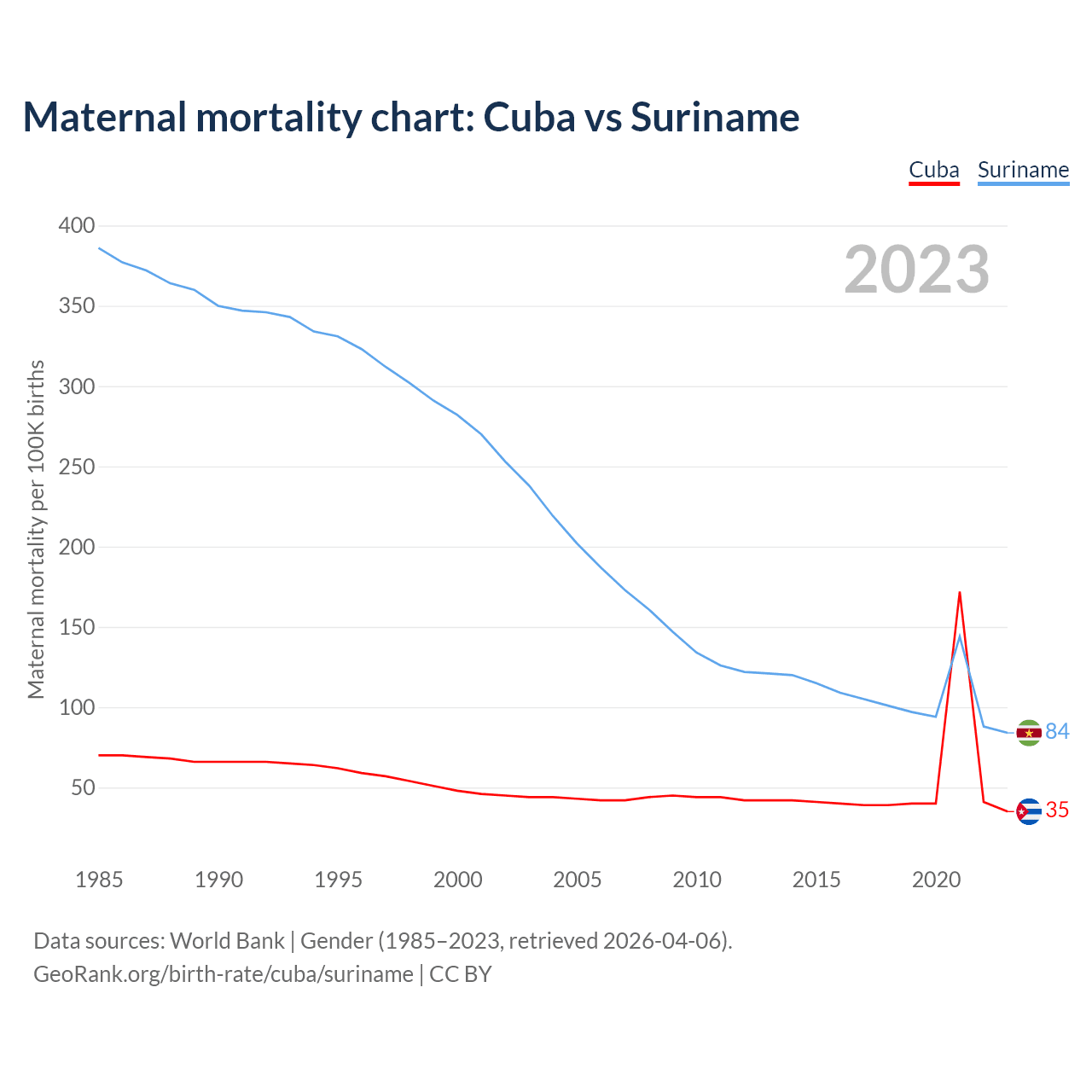 The maternal mortality rate, which is the probability of dying during childbirth or within 42 days of pregnancy termination, is 35 deaths per 100,000 live births in Cuba, compared to 84 deaths in Suriname.