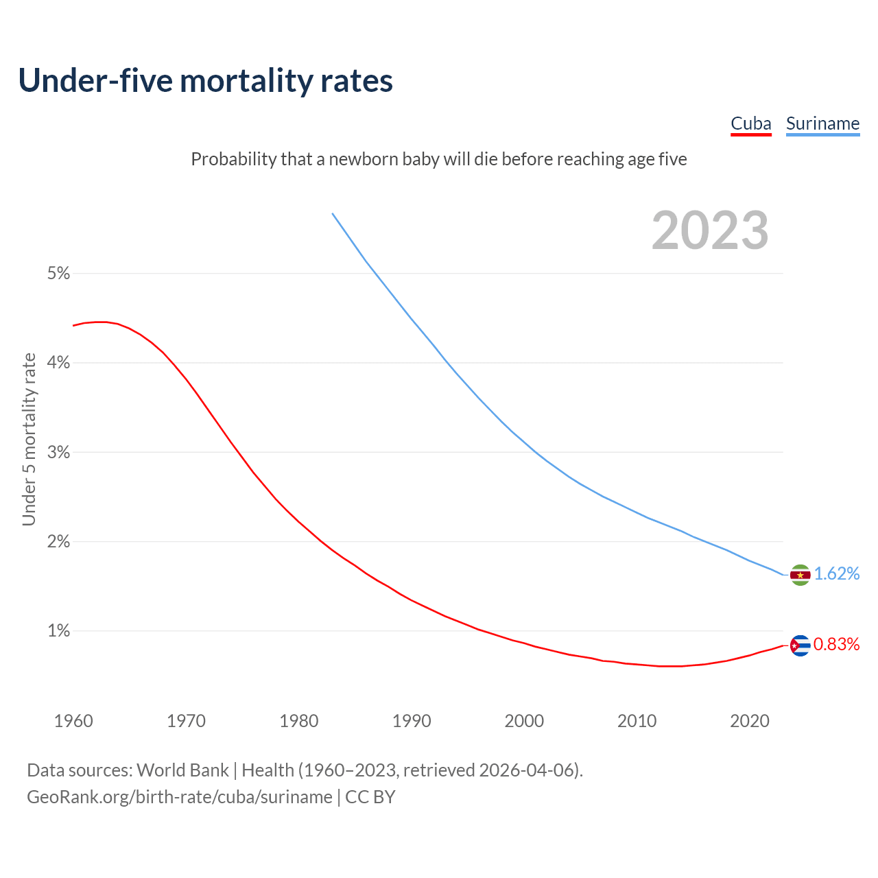 The chance that a newborn baby will die before reaching age five is 0.83% in Cuba and 1.62% in Suriname. Above is a chart with historical data on under-five mortality rates.