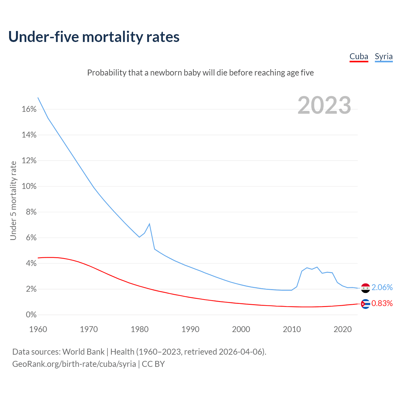 The chance that a newborn baby will die before reaching age five is 0.83% in Cuba and 2.06% in Syria. Above is a chart with historical data on under-five mortality rates.