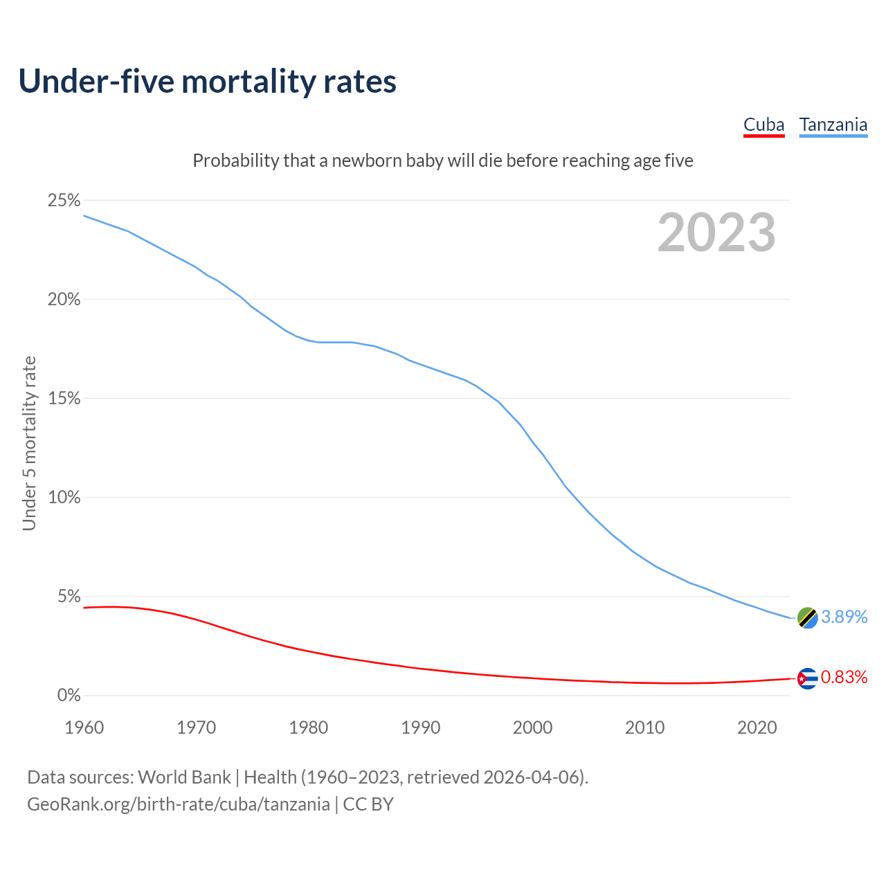 The chance that a newborn baby will die before reaching age five is 0.83% in Cuba and 3.89% in Tanzania. Above is a chart with historical data on under-five mortality rates.