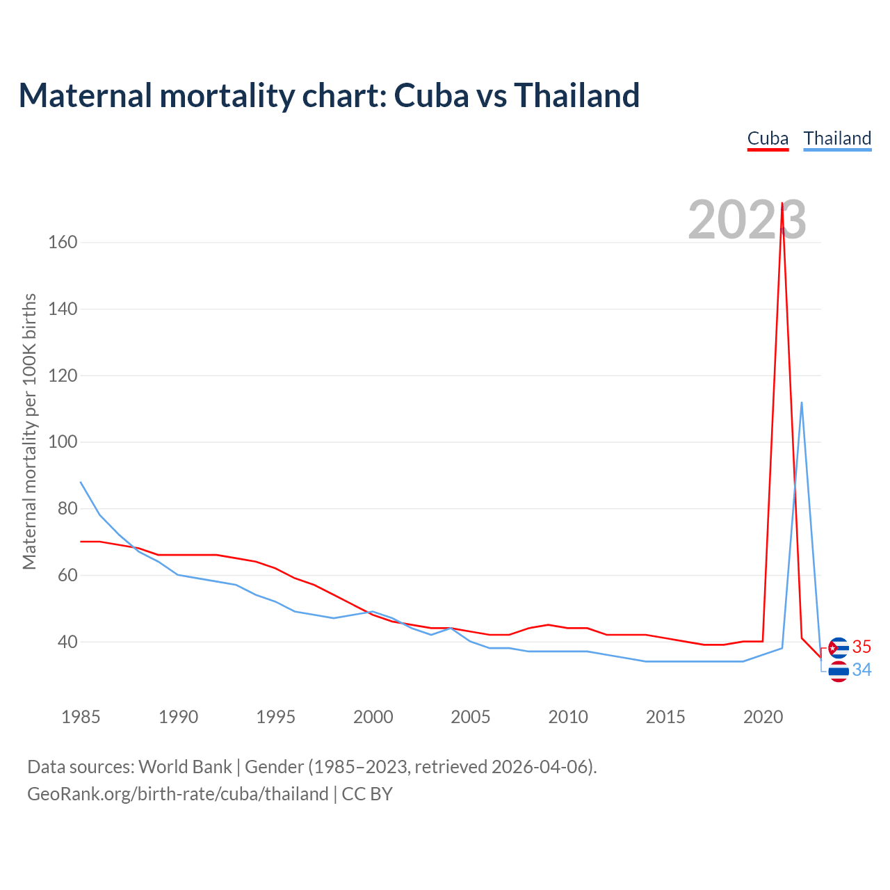 The maternal mortality rate, which is the probability of dying during childbirth or within 42 days of pregnancy termination, is 35 deaths per 100,000 live births in Cuba, compared to 34 deaths in Thailand.