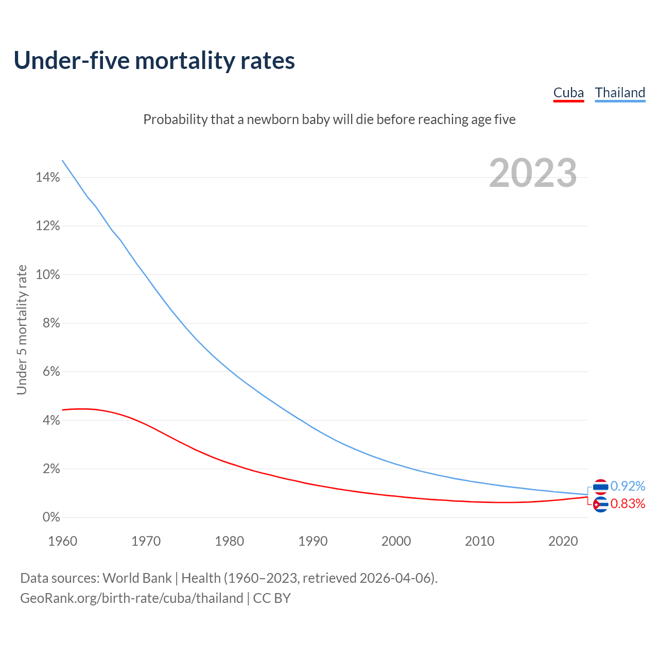 The chance that a newborn baby will die before reaching age five is 0.83% in Cuba and 0.92% in Thailand. Above is a chart with historical data on under-five mortality rates.