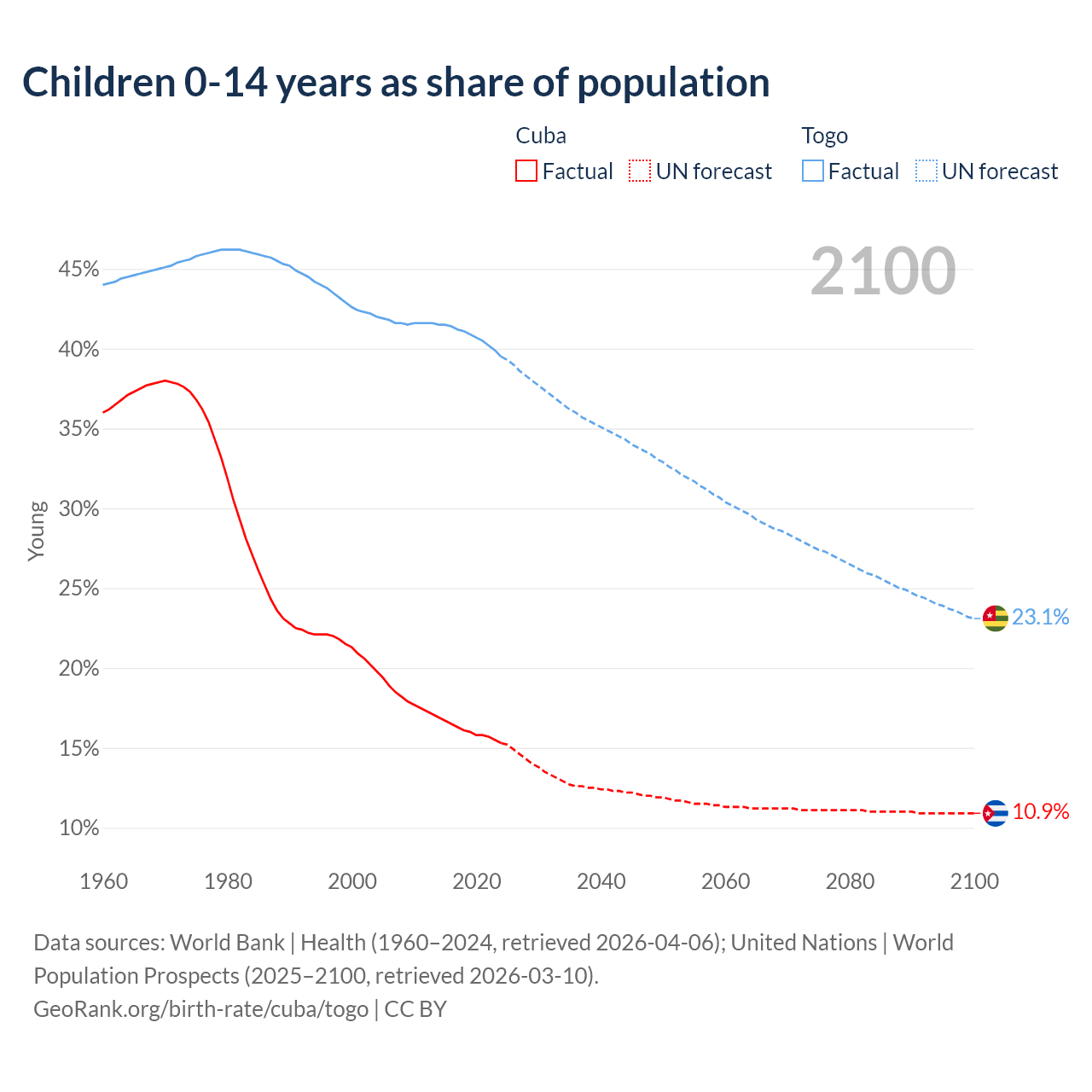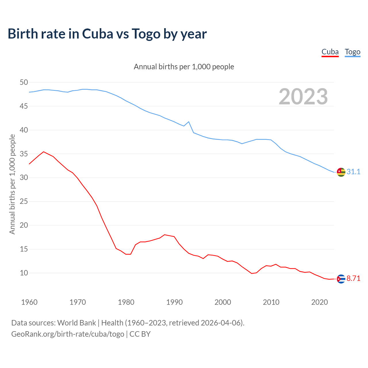 Cuba has an annual birth rate of 8.71 births per 1,000 people, compared to 31.1 for Togo. The average number of children a woman is expected to have during her lifetime — the fertility rate, is 1.44 in Cuba and 4.19 in Togo — 191.3% difference.