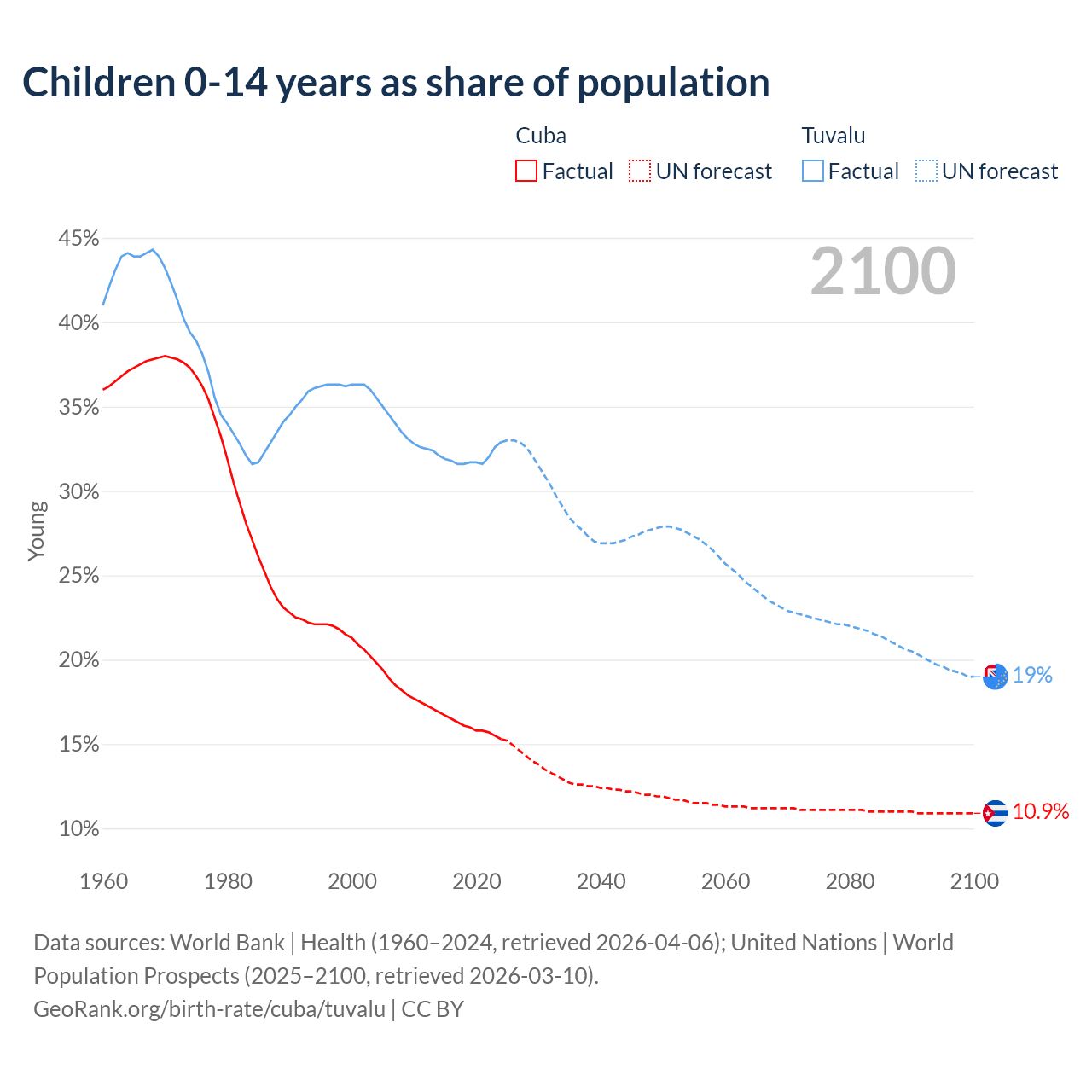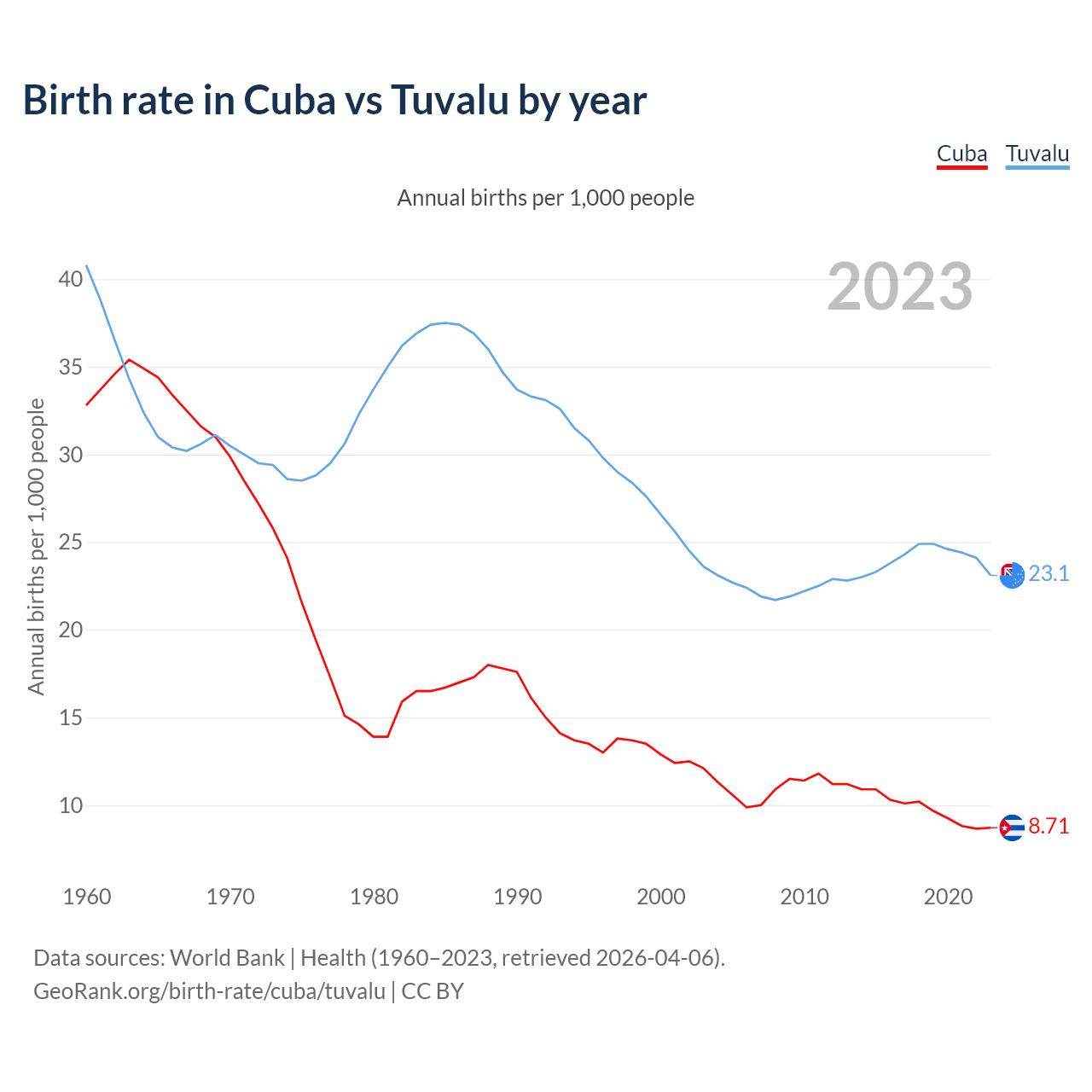 Cuba has an annual birth rate of 8.71 births per 1,000 people, compared to 23.1 for Tuvalu. The average number of children a woman is expected to have during her lifetime — the fertility rate, is 1.44 in Cuba and 3.21 in Tuvalu — 122.9% difference.