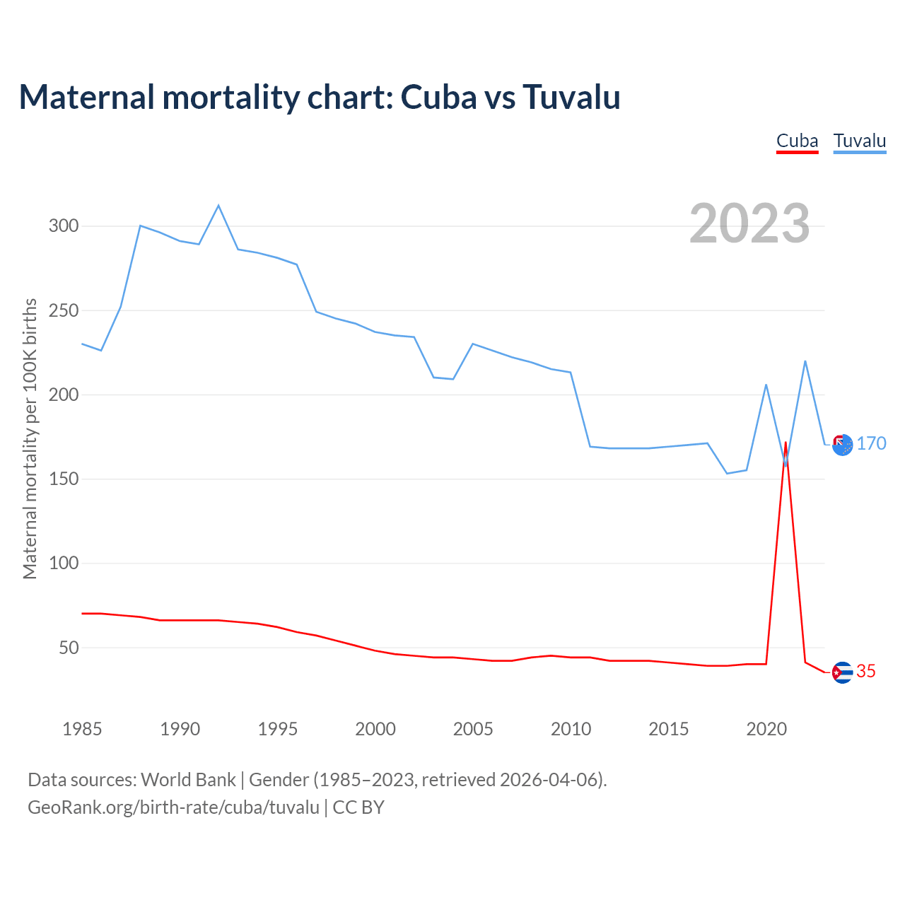 The maternal mortality rate, which is the probability of dying during childbirth or within 42 days of pregnancy termination, is 35 deaths per 100,000 live births in Cuba, compared to 170 deaths in Tuvalu.