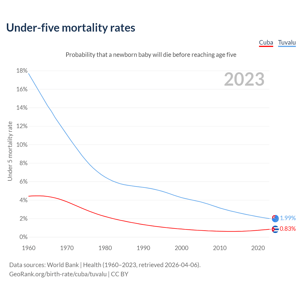 The chance that a newborn baby will die before reaching age five is 0.83% in Cuba and 1.99% in Tuvalu. Above is a chart with historical data on under-five mortality rates.