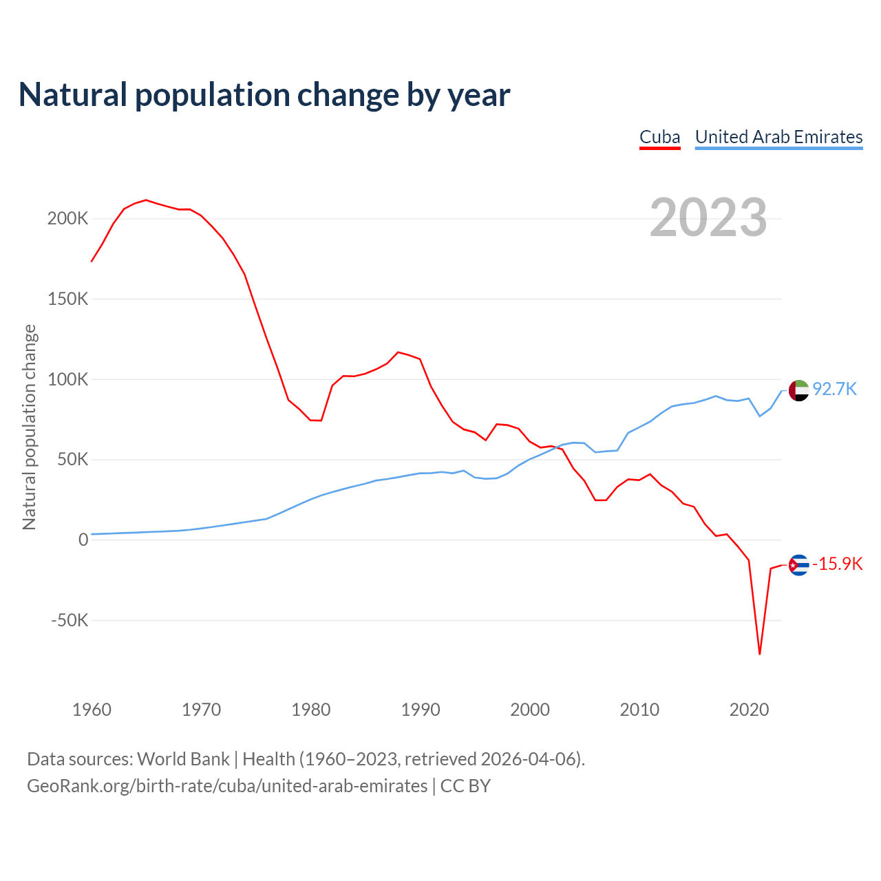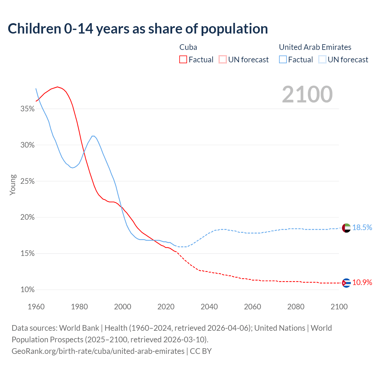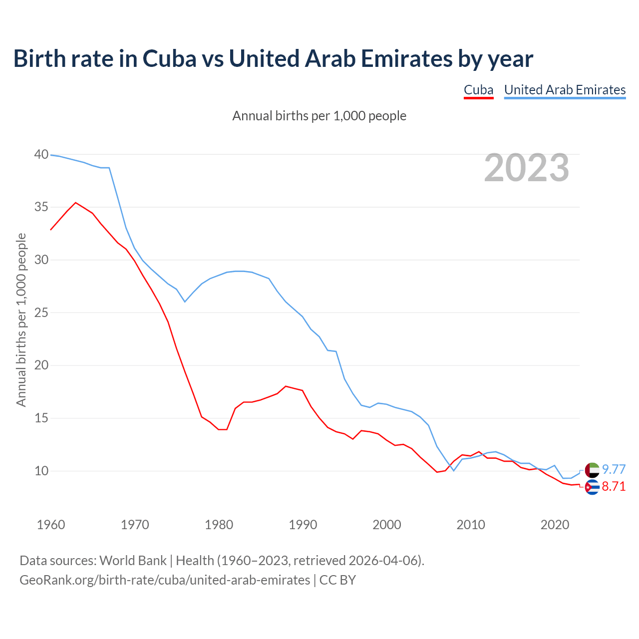 Cuba has an annual birth rate of 8.71 births per 1,000 people, compared to 9.77 for the United Arab Emirates. The average number of children a woman is expected to have during her lifetime — the fertility rate, is 1.44 in Cuba and 1.2 in the United Arab Emirates — 16.6% difference.