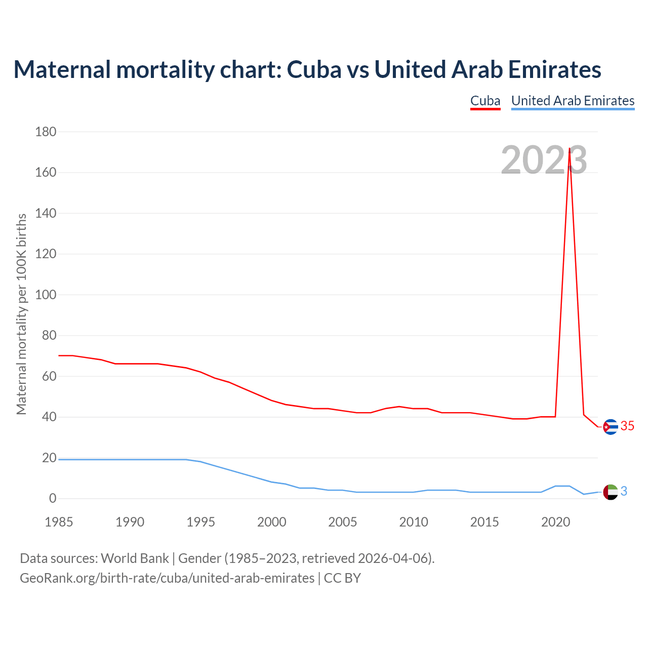 The maternal mortality rate, which is the probability of dying during childbirth or within 42 days of pregnancy termination, is 35 deaths per 100,000 live births in Cuba, compared to 3 deaths in the United Arab Emirates.