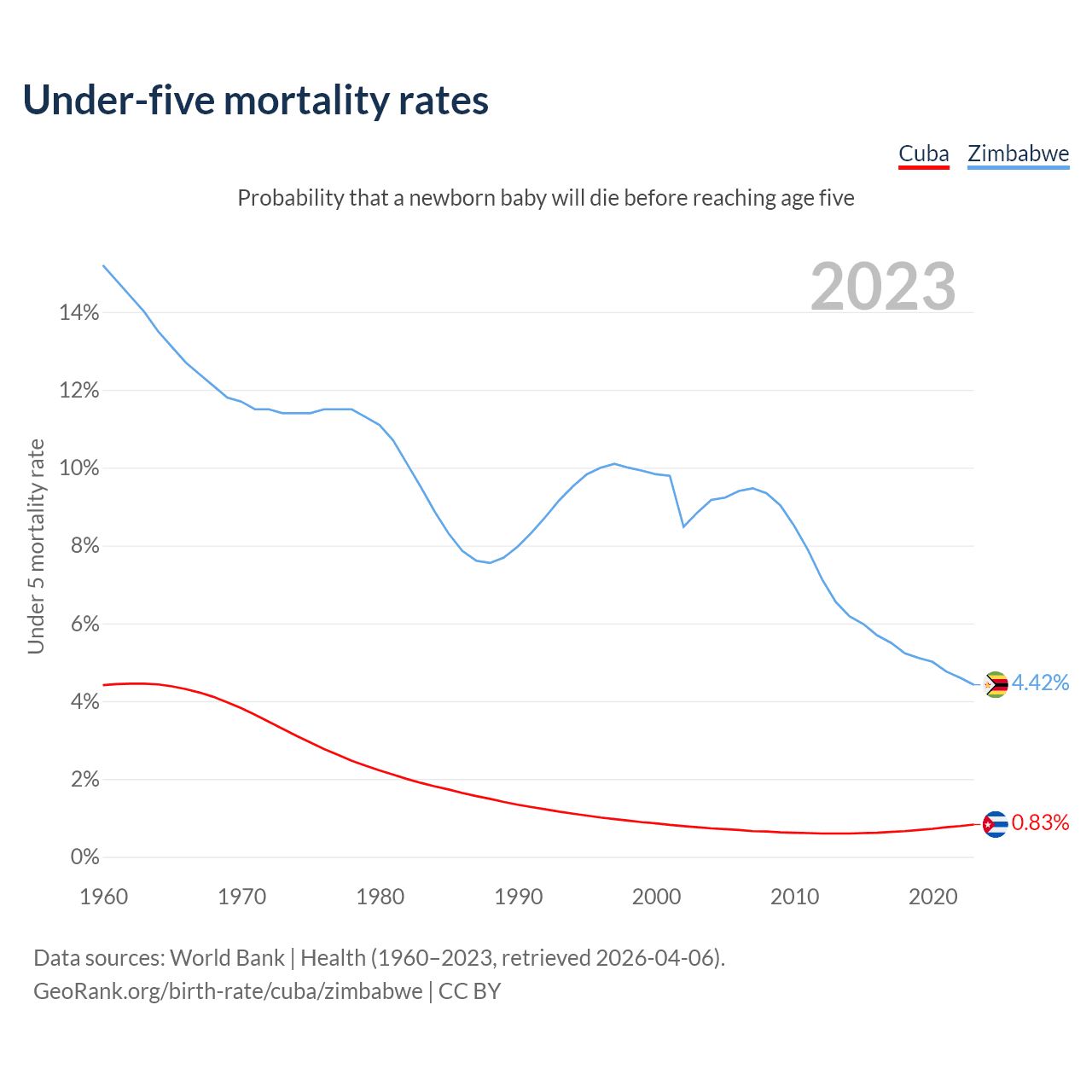 The chance that a newborn baby will die before reaching age five is 0.83% in Cuba and 4.42% in Zimbabwe. Above is a chart with historical data on under-five mortality rates.