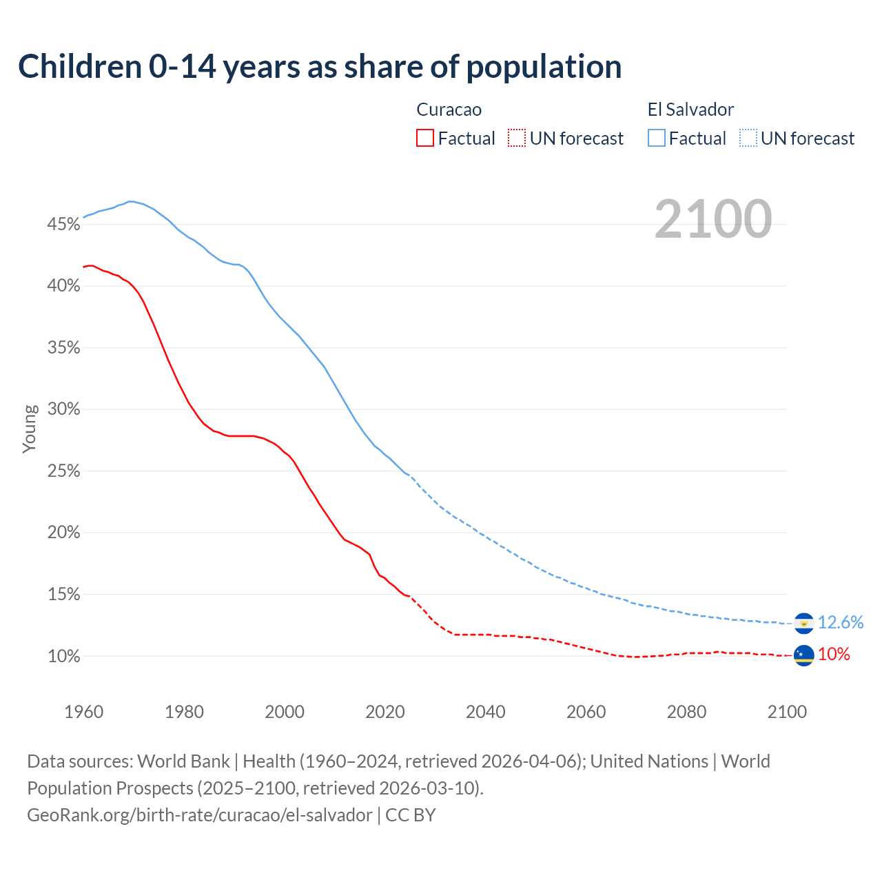 According to the latest available data on birth rates, the fertility rate in Curacao was 1.2 children per woman in 2023, compared to 1.78 in El Salvador in 2023. The replacement level is considered to be 2.1 children per woman.