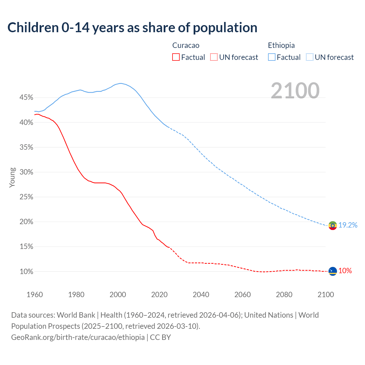 According to the latest available data on birth rates, the fertility rate in Curacao was 1.2 children per woman in 2023, compared to 3.99 in Ethiopia in 2023. The replacement level is considered to be 2.1 children per woman.