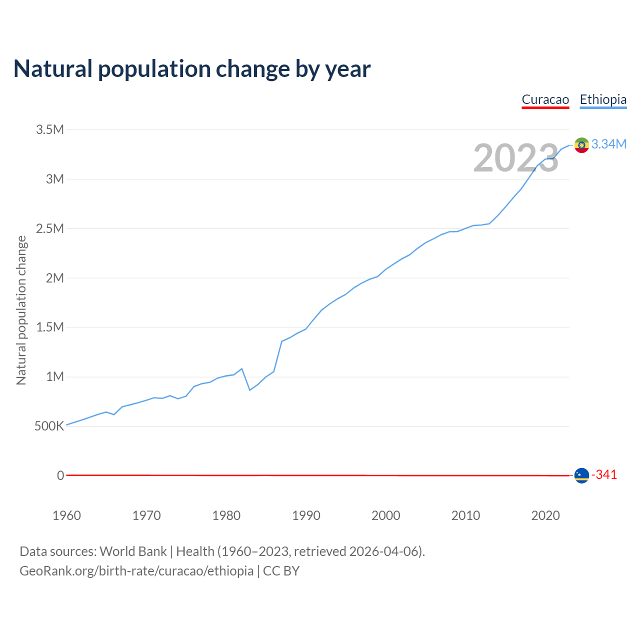 Curacao has an annual birth rate of 7.5 births per 1,000 people, compared to 31.9 for Ethiopia. The average number of children a woman is expected to have during her lifetime — the fertility rate, is 1.2 in Curacao and 3.99 in Ethiopia — 232.4% difference.
