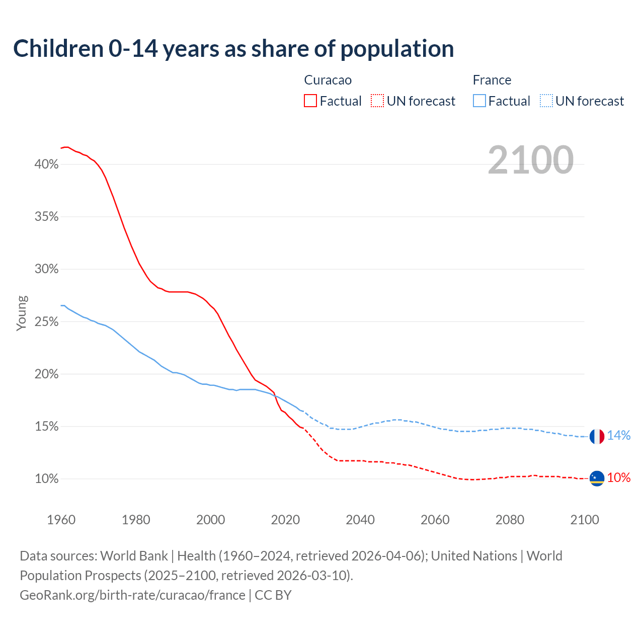 Children aged 0-14 make up 14.9% of the population in Curacao and 16.5% in France in 2024, compared to 27.8% and 20.1% respectively in 1990.