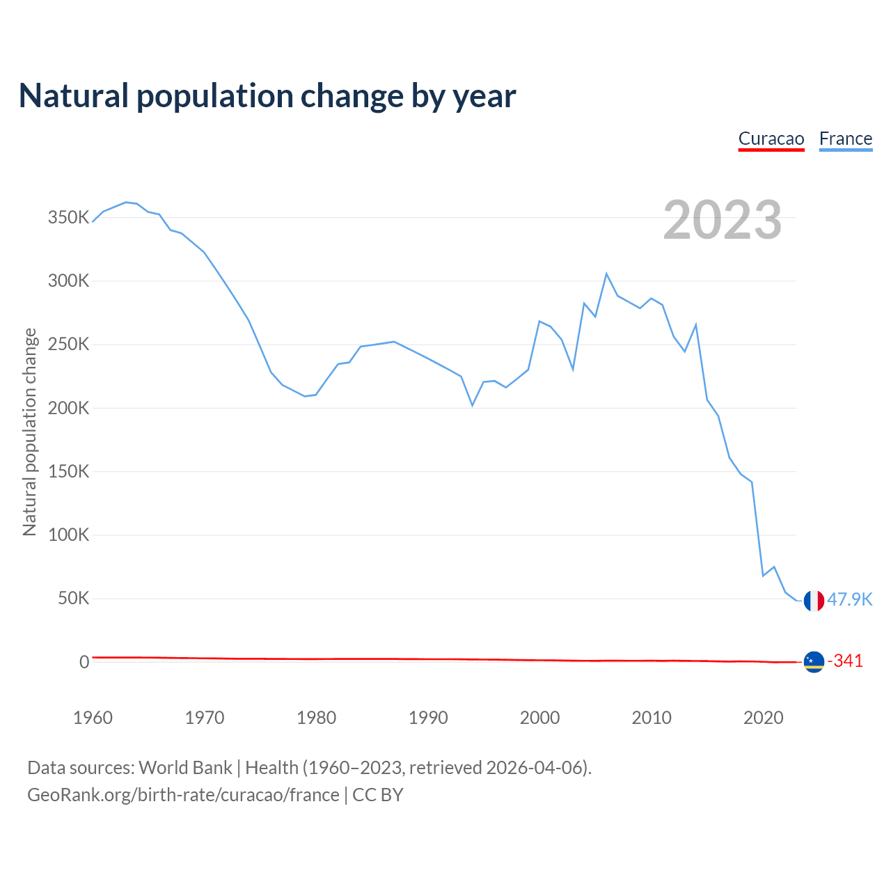 Curacao has an annual birth rate of 7.5 births per 1,000 people, compared to 9.9 for France. The average number of children a woman is expected to have during her lifetime — the fertility rate, is 1.2 in Curacao and 1.66 in France — 38.3% difference.