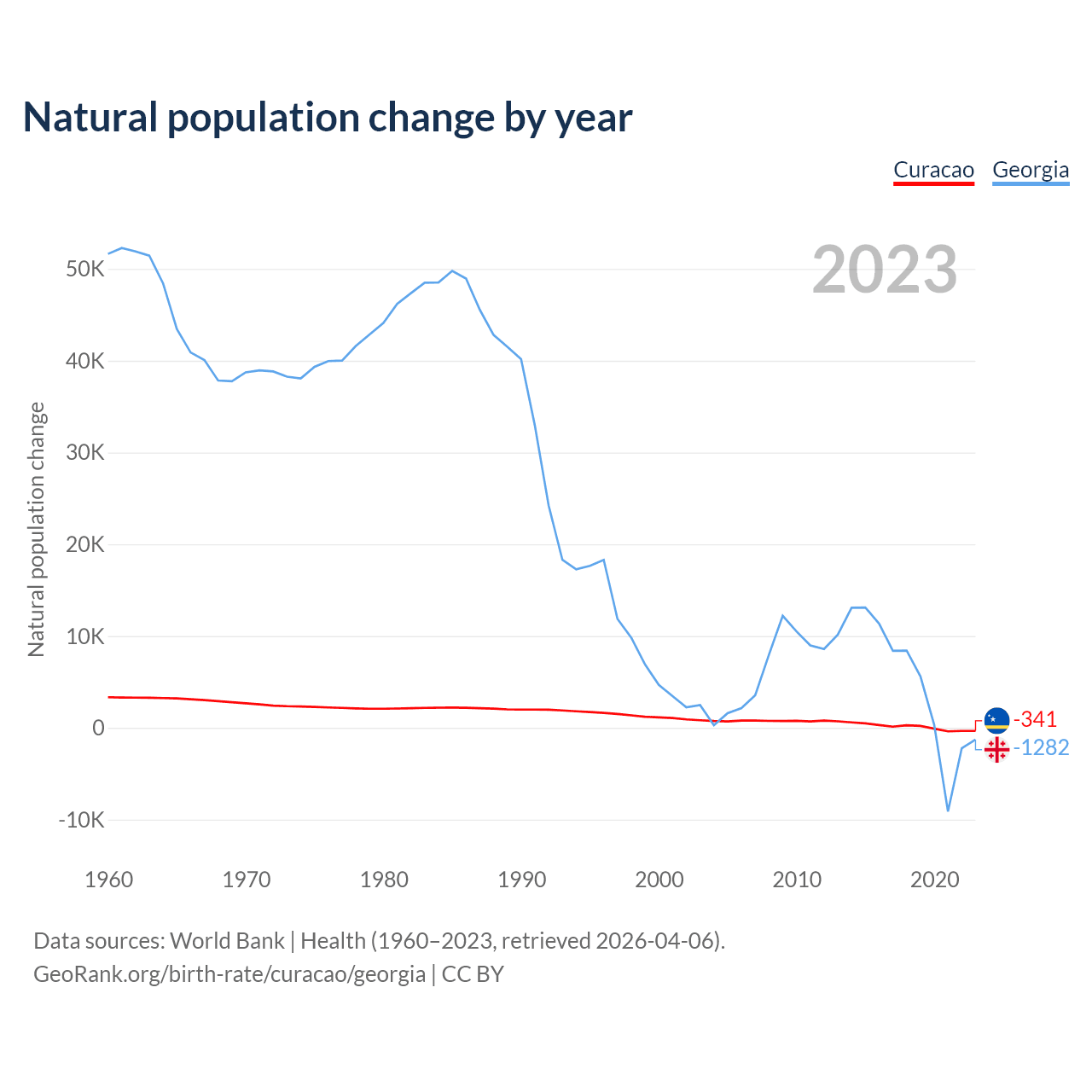 According to the latest available data on birth rates, the fertility rate in Curacao was 1.2 children per woman in 2023, compared to 1.81 in Georgia in 2023. The replacement level is considered to be 2.1 children per woman.