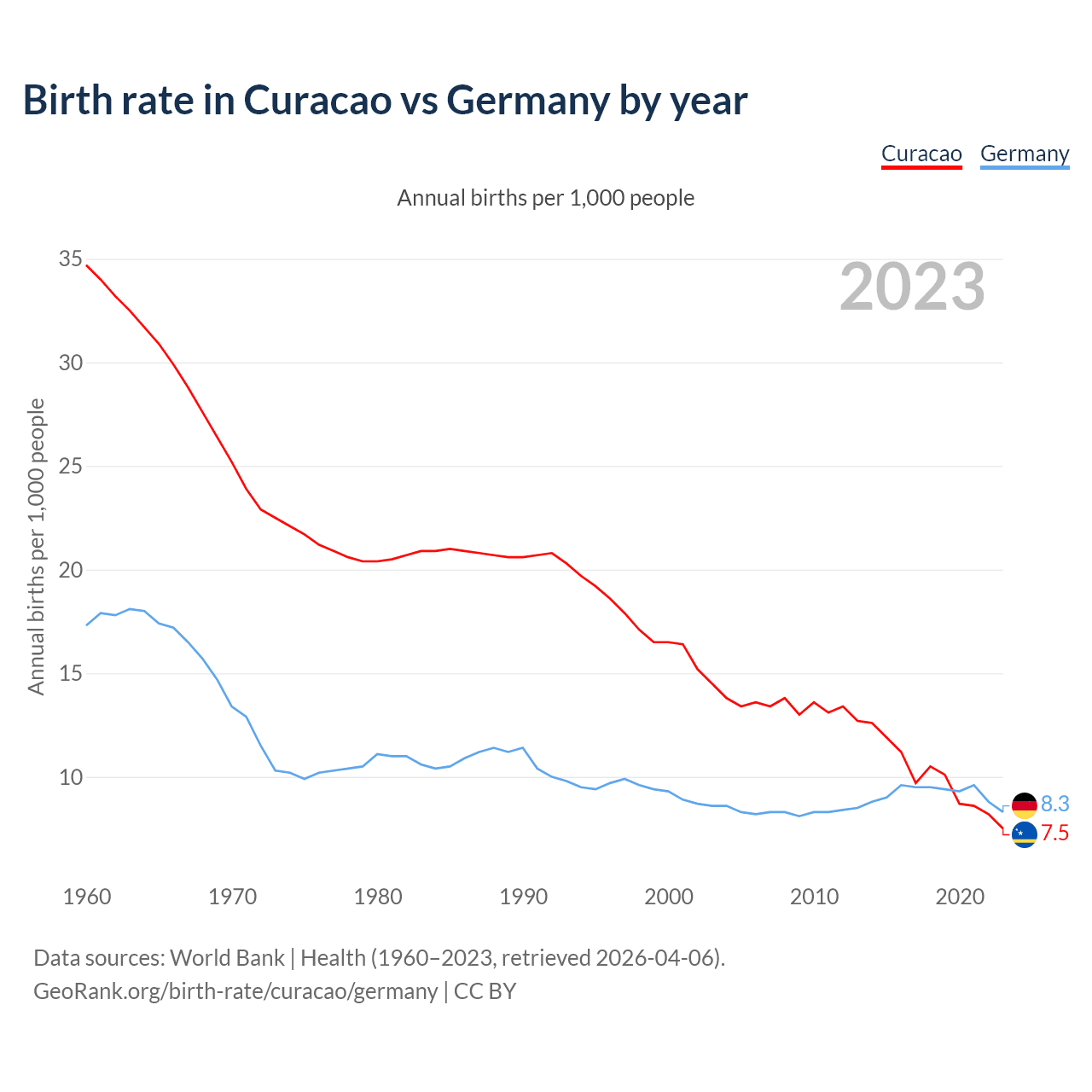 Curacao has an annual birth rate of 7.5 births per 1,000 people, compared to 8.3 for Germany. The average number of children a woman is expected to have during her lifetime — the fertility rate, is 1.2 in Curacao and 1.39 in Germany — 15.8% difference.