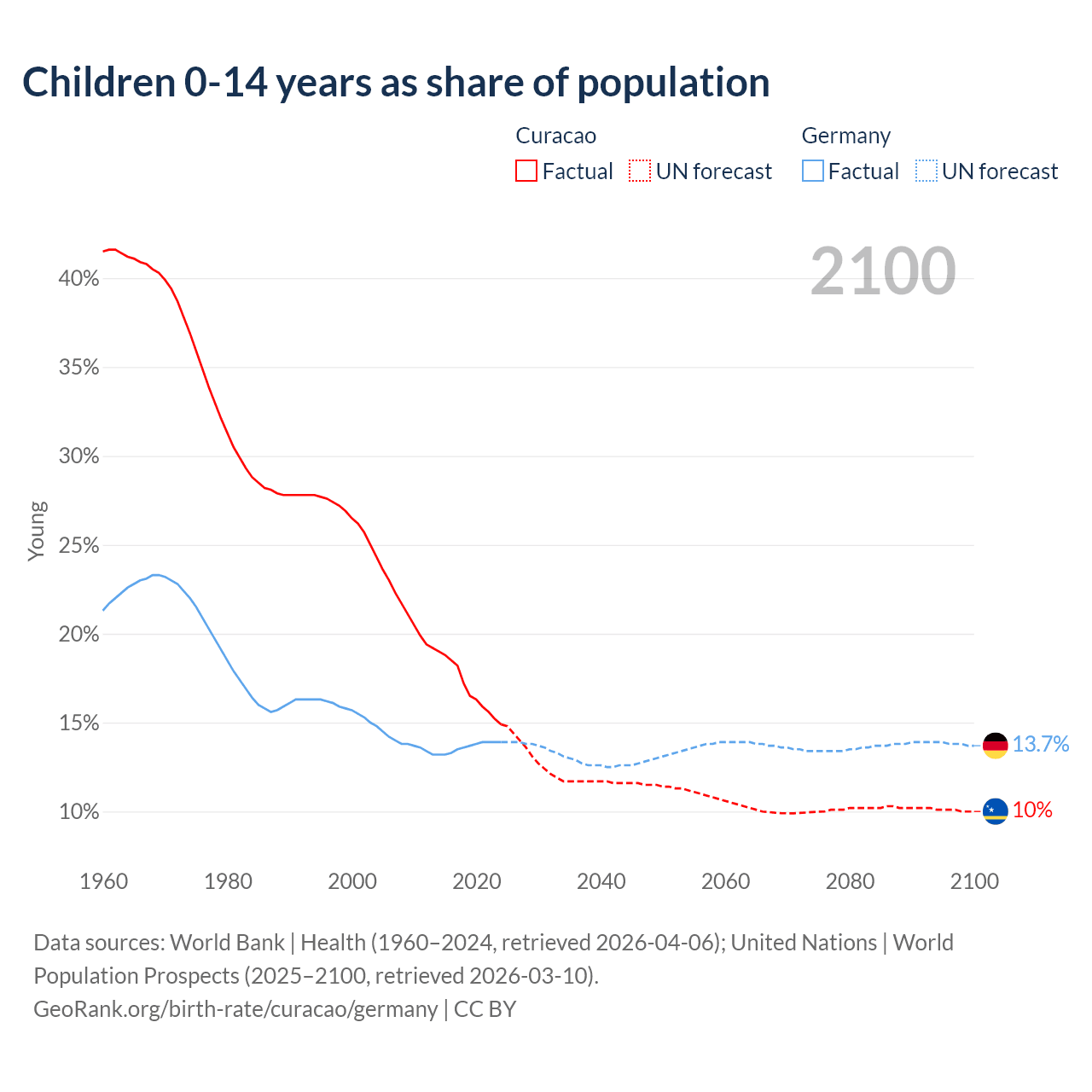 Children aged 0-14 make up 14.9% of the population in Curacao and 13.9% in Germany in 2024, compared to 27.8% and 16.1% respectively in 1990.