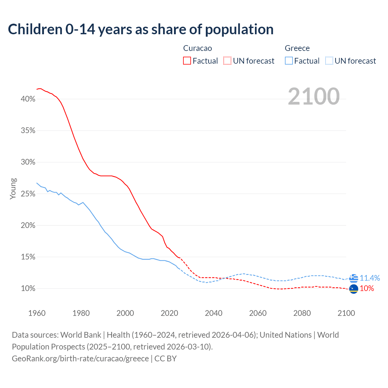 Children aged 0-14 make up 14.9% of the population in Curacao and 13.2% in Greece in 2024, compared to 27.8% and 19.4% respectively in 1990.