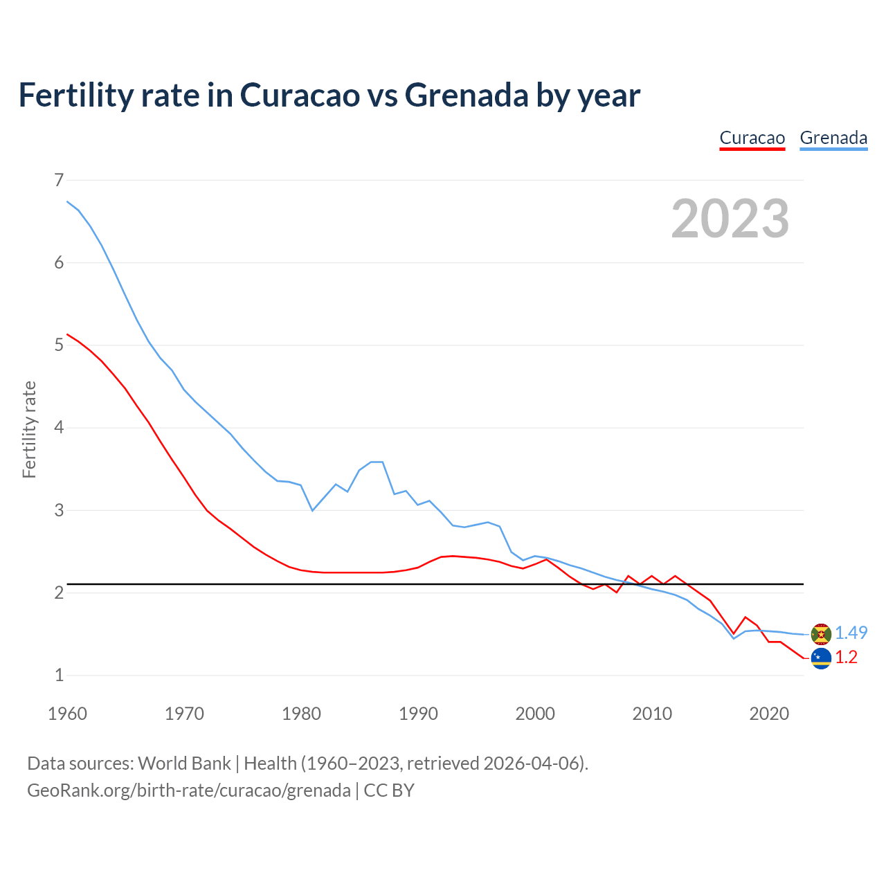 1960 vs 2023, the fertility rate has decreased by 76.6% in Curacao and by 77.9% in Grenada — in 1960, it was 5.13 and 6.74, respectively.