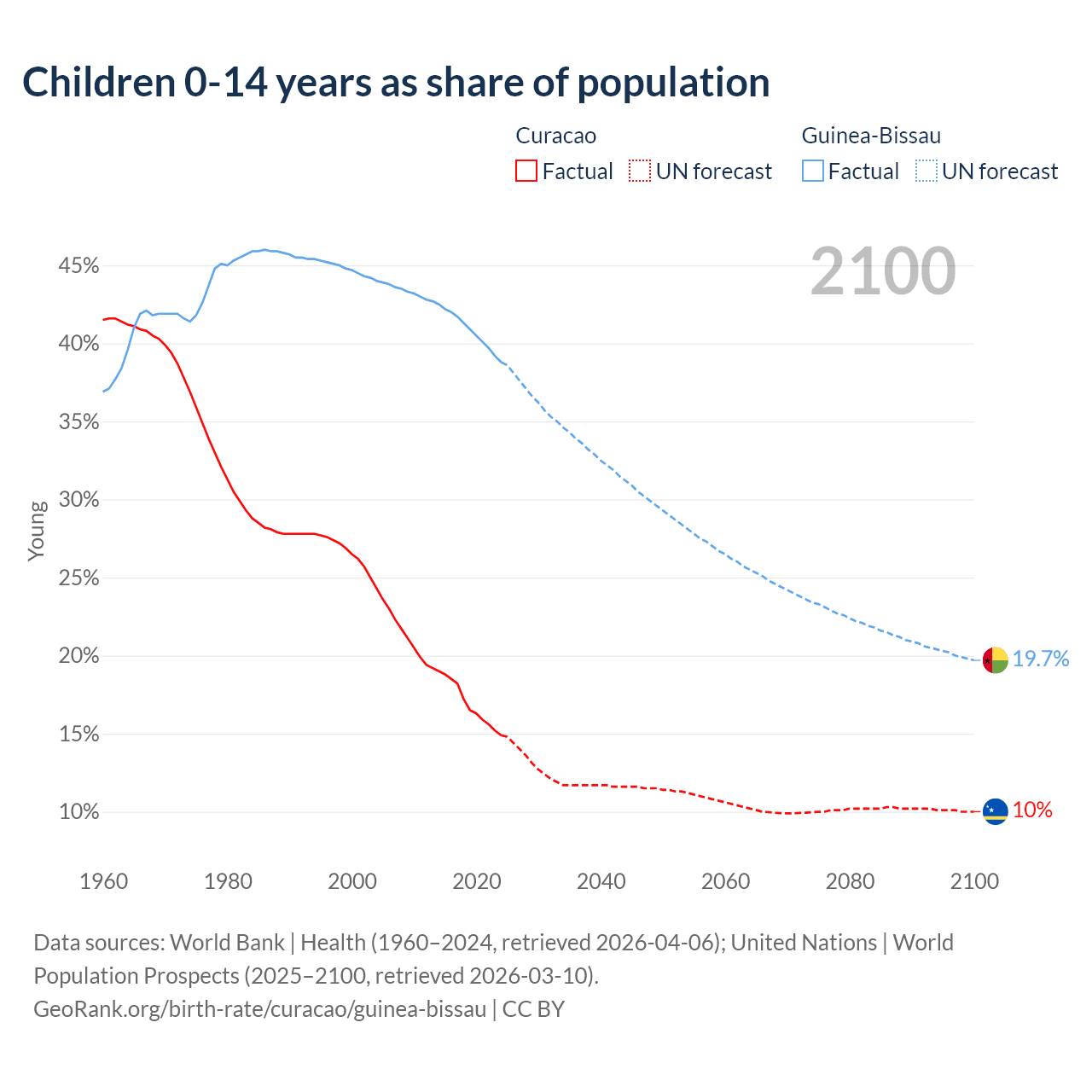 Children aged 0-14 make up 14.9% of the population in Curacao and 38.8% in Guinea-Bissau in 2024, compared to 27.8% and 45.7% respectively in 1990.