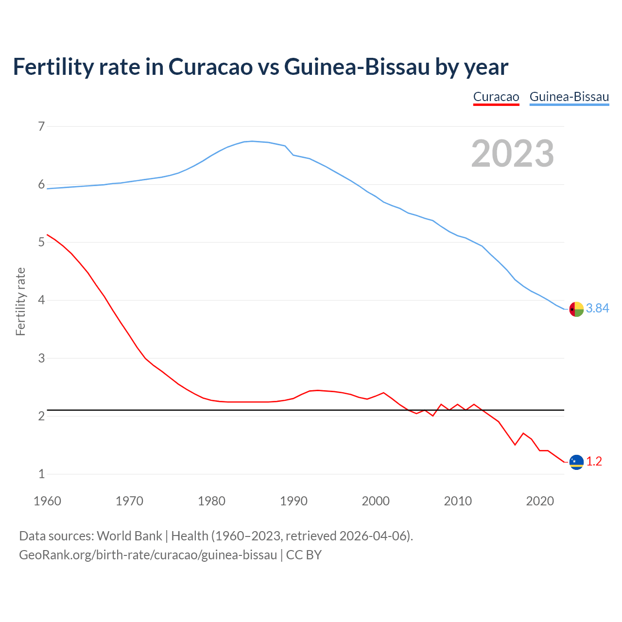 According to the latest available data on birth rates, the fertility rate in Curacao was 1.2 children per woman in 2023, compared to 3.84 in Guinea-Bissau in 2023. The replacement level is considered to be 2.1 children per woman.