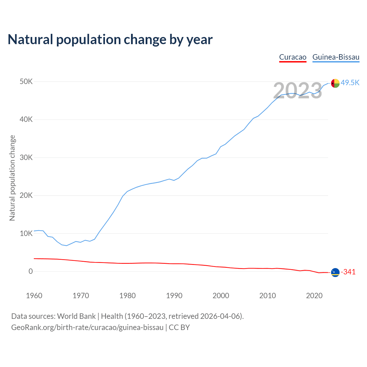 Curacao has an annual birth rate of 7.5 births per 1,000 people, compared to 30 for Guinea-Bissau. The average number of children a woman is expected to have during her lifetime — the fertility rate, is 1.2 in Curacao and 3.84 in Guinea-Bissau — 219.7% difference.