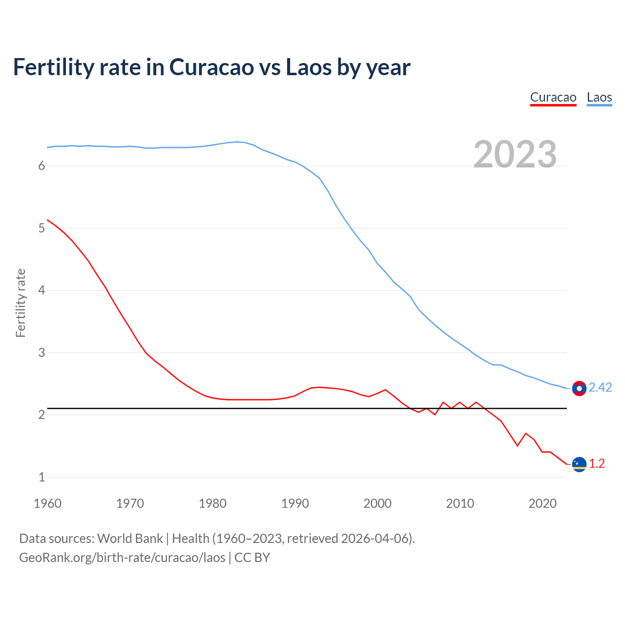 1960 vs 2023, the fertility rate has decreased by 76.6% in Curacao and by 61.5% in Laos — in 1960, it was 5.13 and 6.29, respectively.